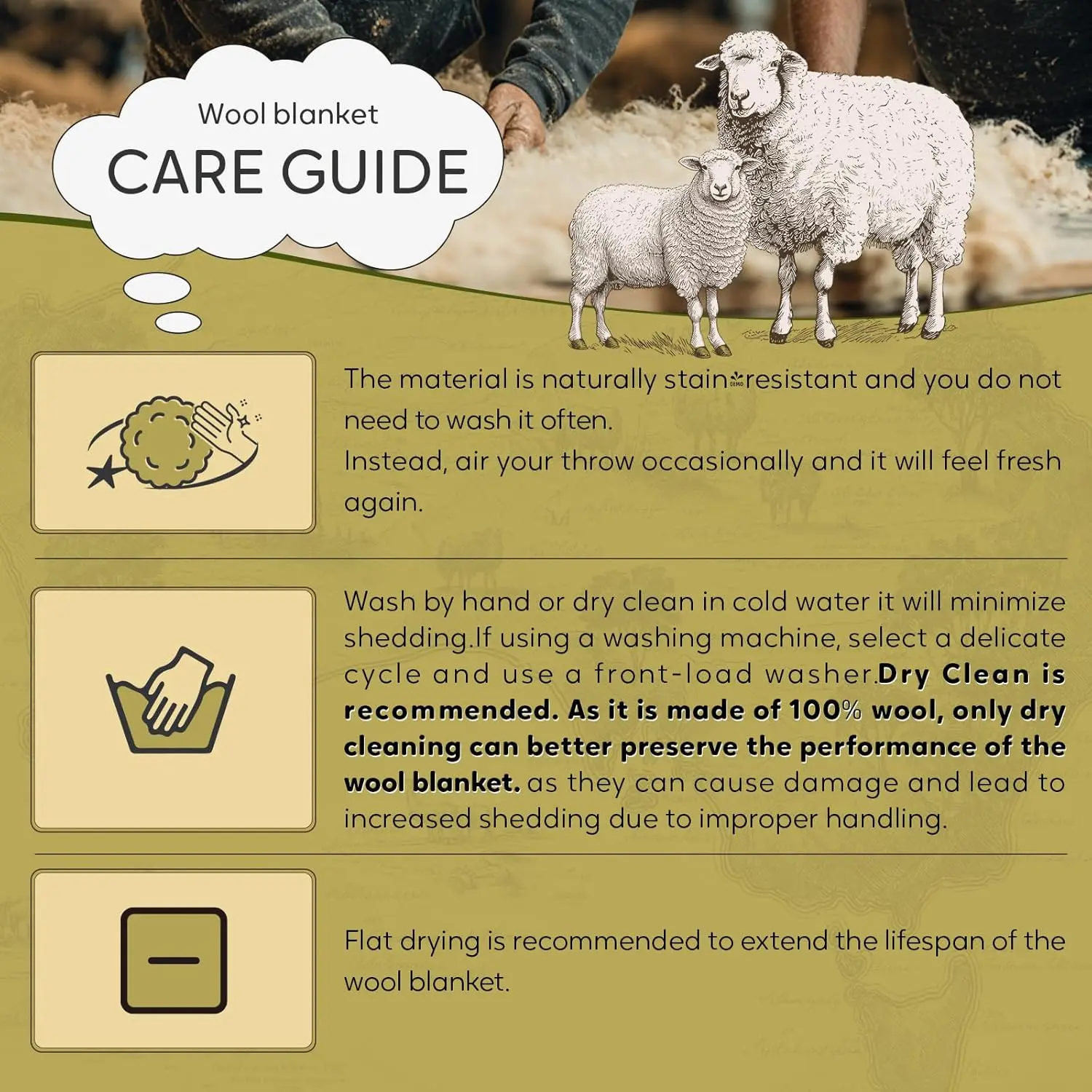 100% VIRGIN WOOL BLANKE - Our thick wool blanket is made with 100% virgin wool filling, with an average diameter of no more than 25 microns (600GSM).Made from virgin wool, As a renewable resource, it is more robust and durable compared to recycled wool.We are committed to sustainable development and protecting the earth.PERFECT EDGE TREATMENT - The heavy wool blanket uses thicker yarn and sub busbar seam technology to prevent edge seam wear.This ensures high quality and a long lifespan, making it look at home in the woods or on the couch.Wool is a natural flame retardant material.SOFT AND SKIN-FRIENDLY - Our military wool blanket undergoes advanced wool carding process, making it thinner, more comfortable, and fluffy. It is not scratchy, stain-resistant, and can be used for a long time. The production process includes three high-temperature washes, significantly improving odor and softness.INDOOR OR OUTDOOR - The large size (62"x 86") of the pure wool blanket keeps you and your friends warm and cozy during camping, tailgating parties, or outdoor concerts.It is also great for military surplus, camping, hiking, stargazing, backpacking, jungle expeditions, boating, fishing, hunting, or keeping in the car trunk as an emergency preparedness blanket.CONVENIENT PORTABILITY - Our wool throw blanket is equipped with a premium PU strap, strong yet flexible, you can easily carry this wool blanket wherever you go, ensuring warmth and comfort at all times.EASY MAINTENANCE-Thanks to wool blanket, it has self-cleaning function, so it is usually washed once every one or two years.Instead, air your throw occasionally and it will feel fresh again. A little shedding is normal during the first wash, but if you can wash by hand or dry clean in cold water it will minimize shedding. In this way, the wool blanket can be protected and the service life of the wool blanket can be extended, and it may also accompany your life directly.If using a washing machine, select a delicate cycle and use a front-load washer. You can't use the top-load washers with a center agitator, as they can cause damage and lead to increased shedding due to improper handling.
