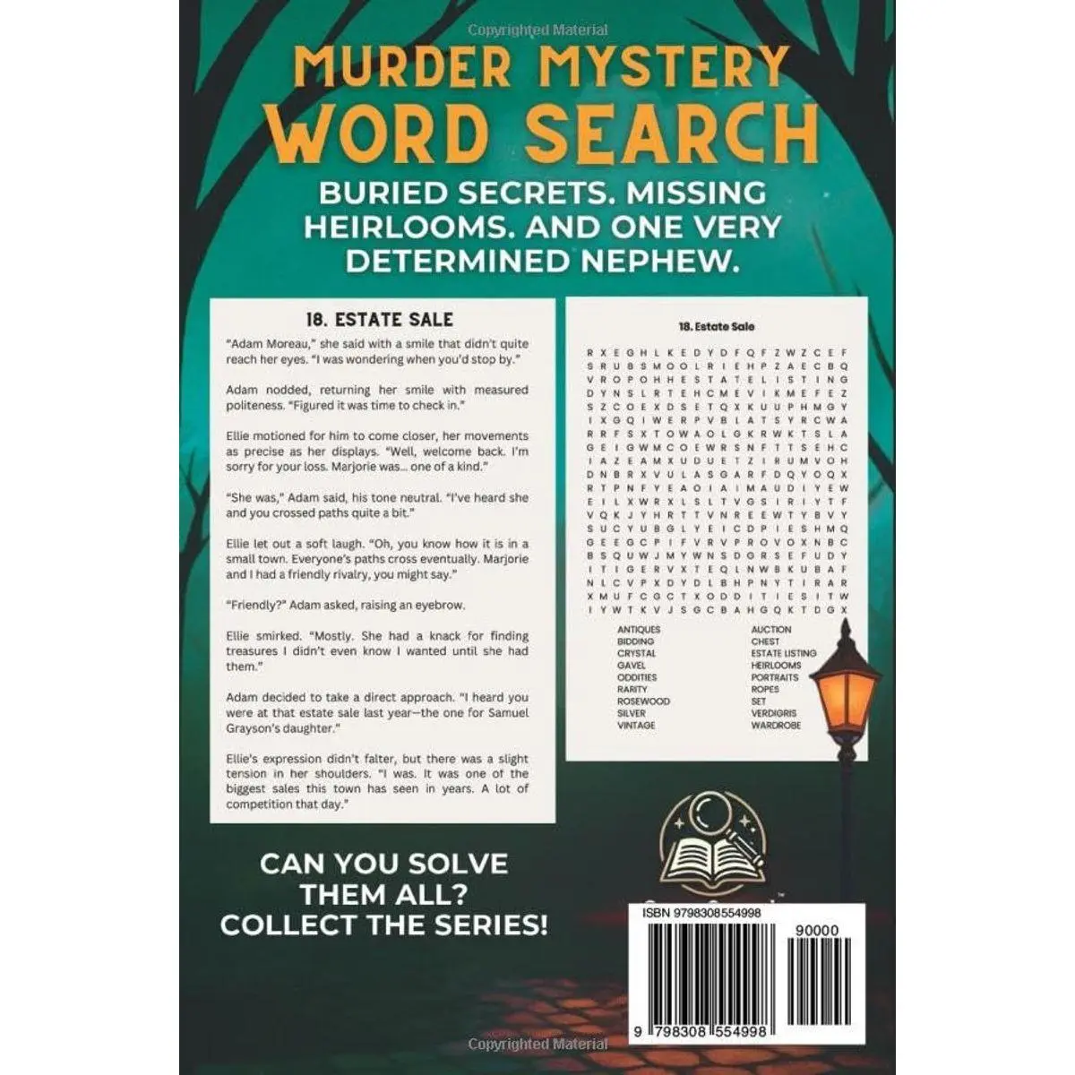 This isn’t just a word search book—it’s a full-fledged cozy mystery, told with a wink and packed with atmosphere. You’ll find 65 themed word search puzzles woven between the chapters, each one steeped in the world of antiques, small-town quirks, and whispered secrets. Think: ticking clocks, creaky floors, and one neighbor who remembers a little too much.
