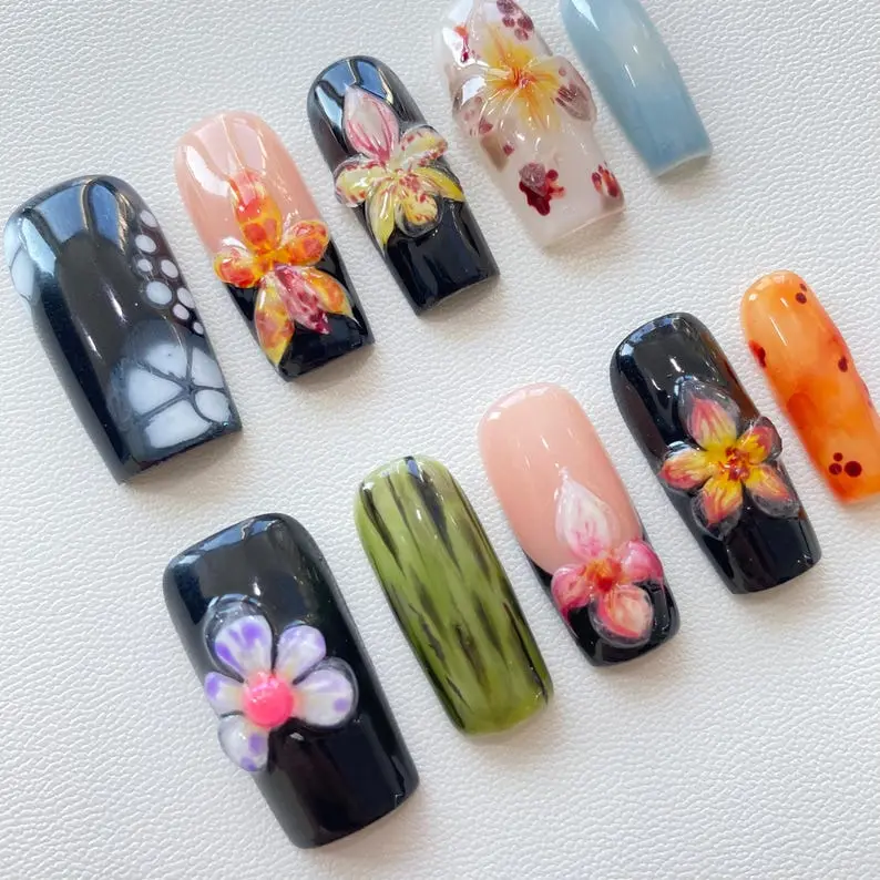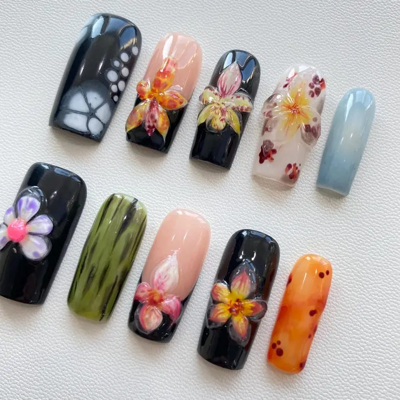 These handmade press-on nails feature a long almond shape, perfect for party and wedding occasions. The elegant design adds a touch of sophistication to any outfit. Ideal for those looking to enhance their look for special events.