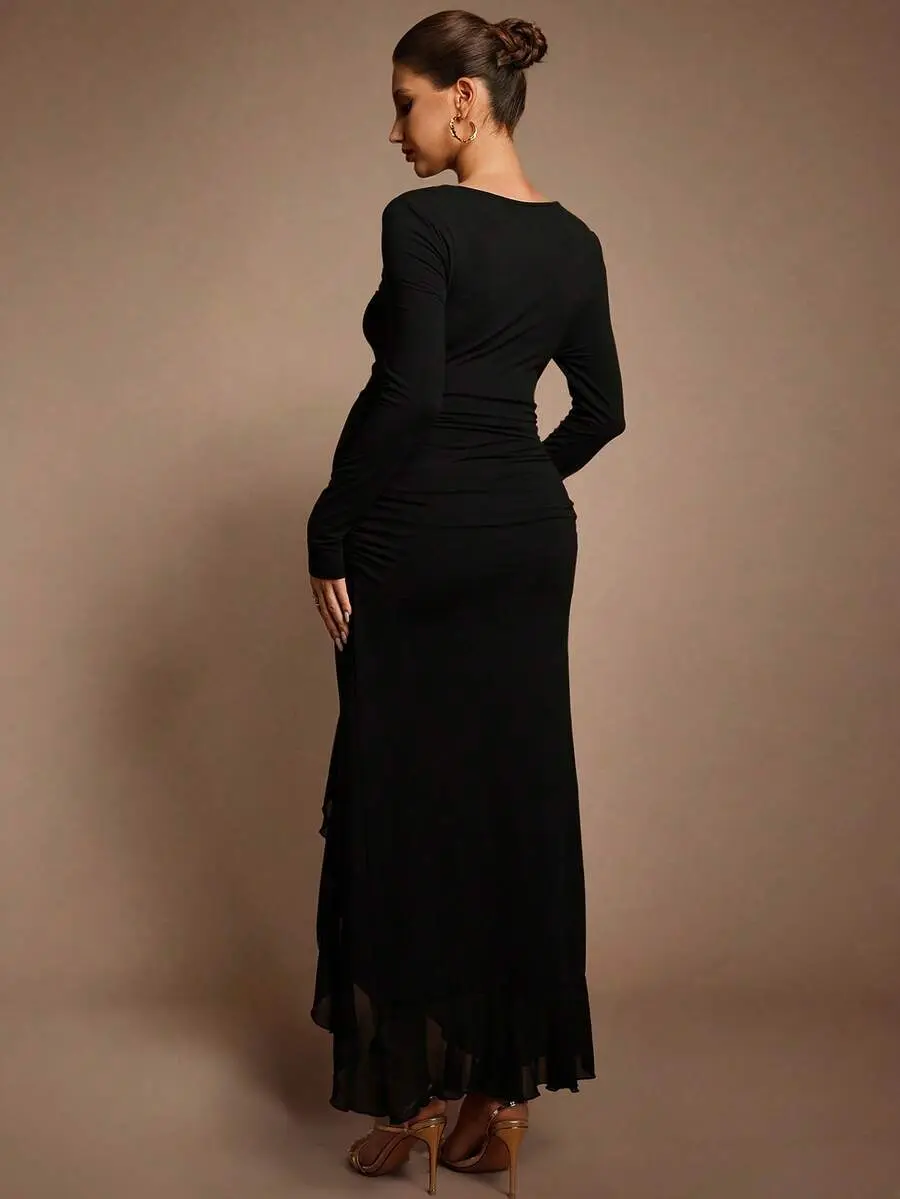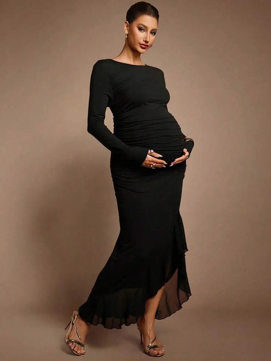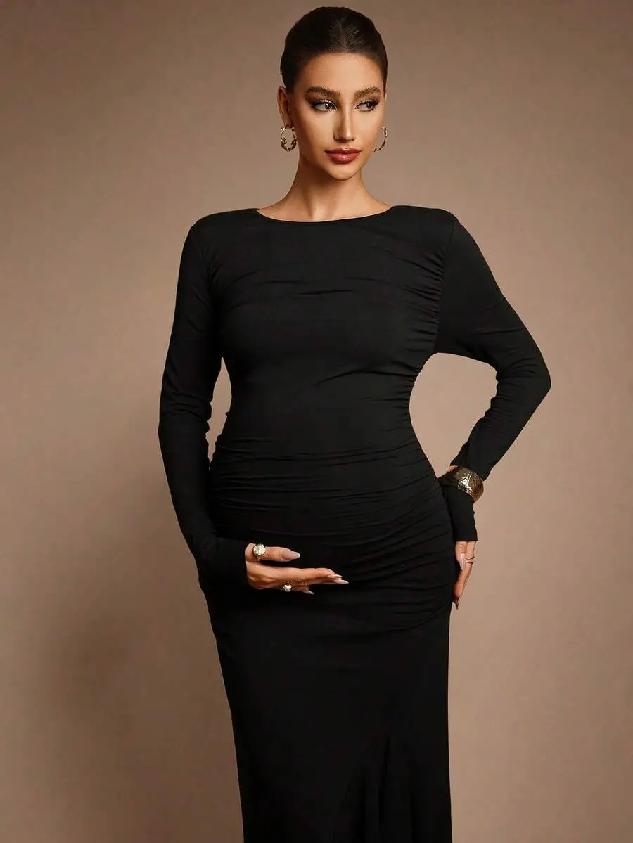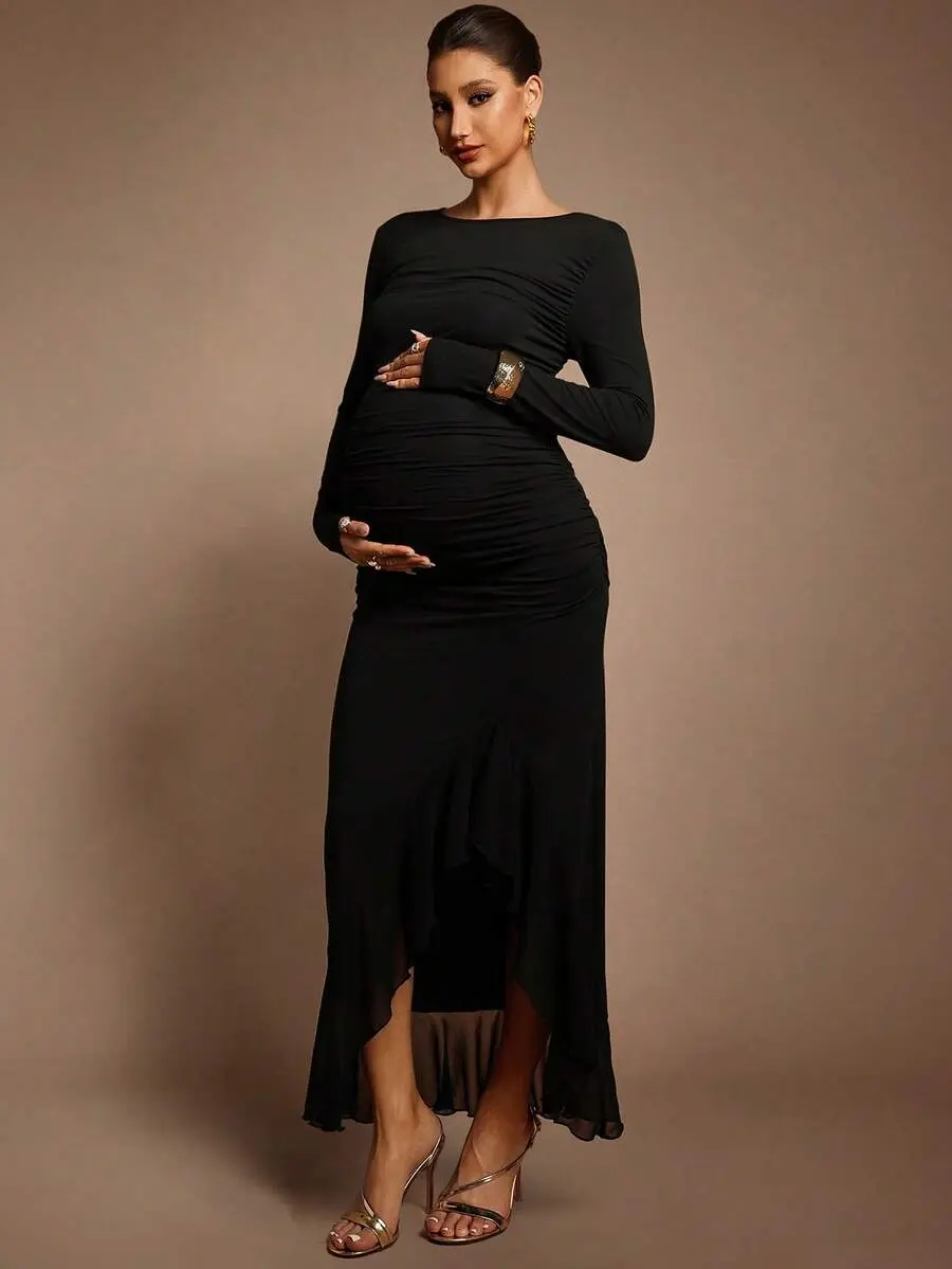 BELLAdresses Autumn And Winter Maternity Black Dress Maternity Solid Color Round Neck Long Sleeve Ruched Asymmetric Hem Elegant Dress Sexy Maternity Dress