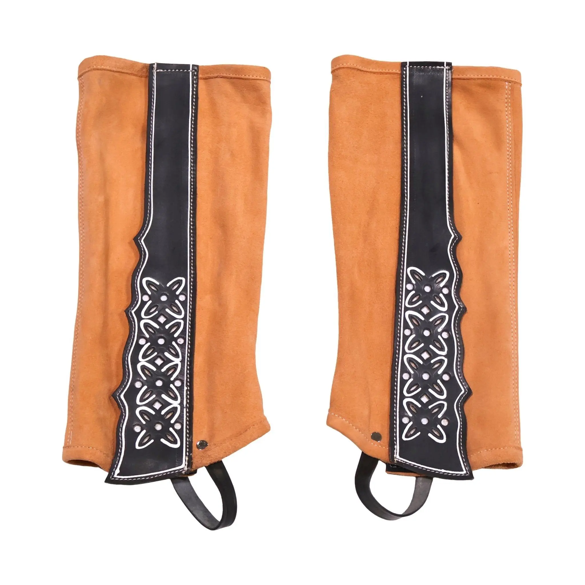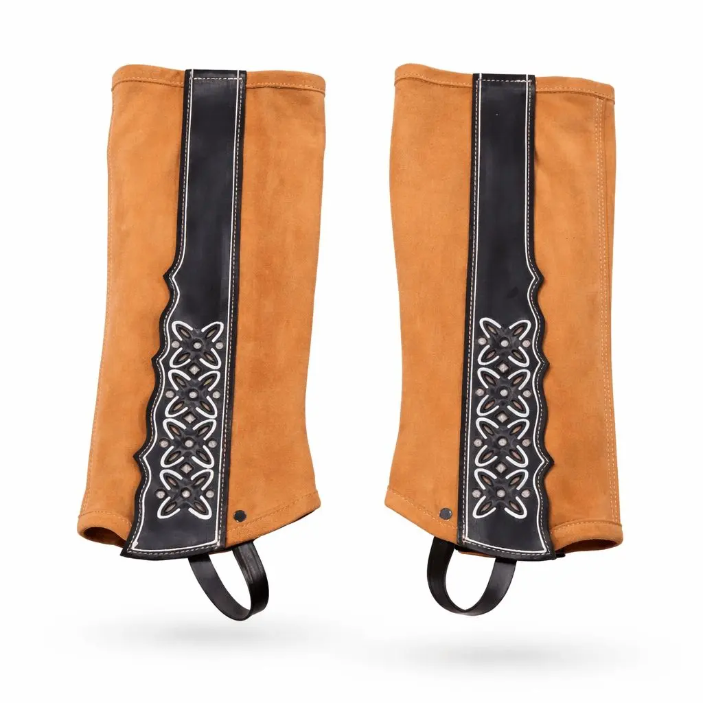 Soft Leather leggings featuring Velcro closures with beautiful custom design. Very comfortable and easy to take on and off, adjustable. Made in Mexico. Polainas de piel con cierres de velcro con diseño al lado. Muy cómodo y fácil de poner y quitar.