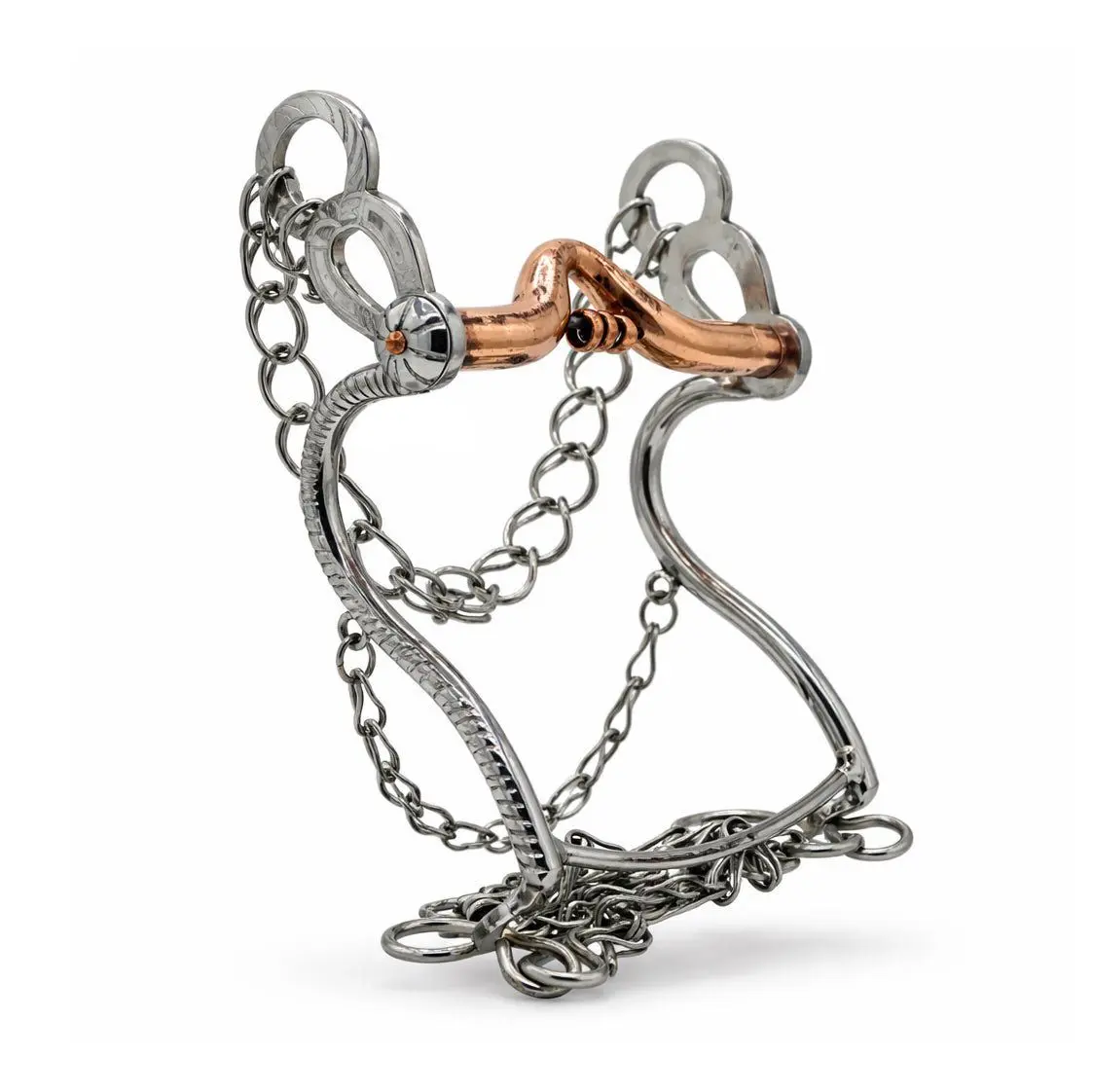 This authentic custom design stainless steel charro horse bit with copper mouth. Includes a complete set of cadenilla chains.