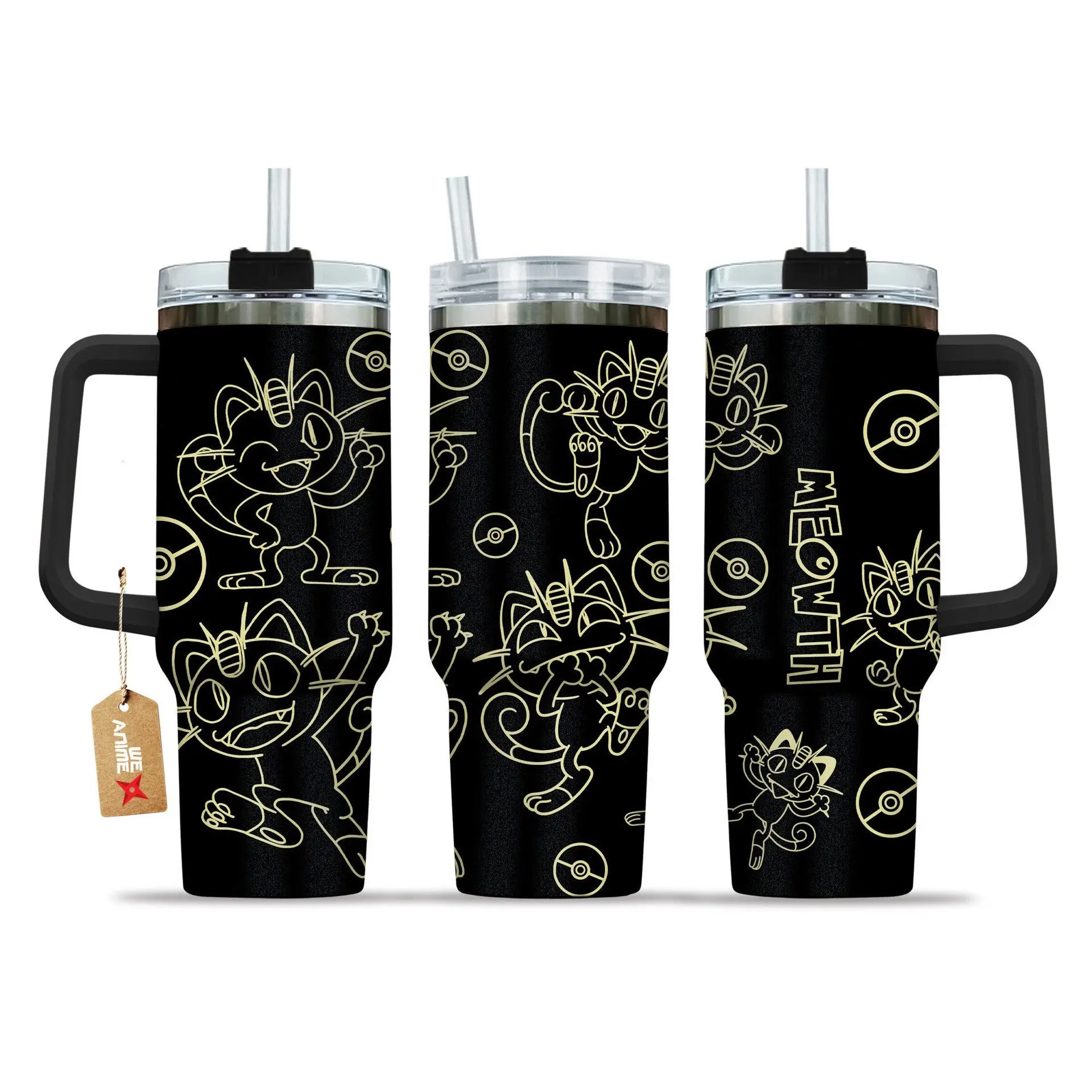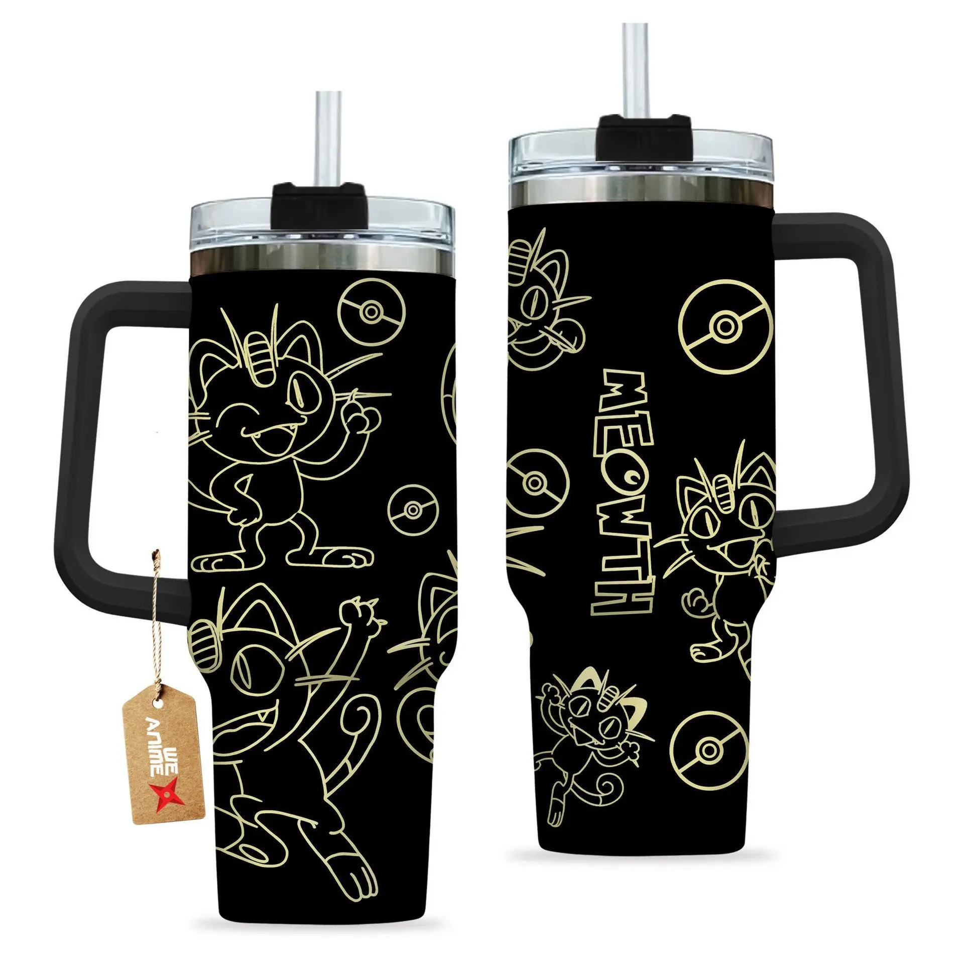 STORMMECH-Meowth 40oz Handle Tumbler – PKM Stainless Steel Travel Mug, Anime Inspired Vacuum Insulated Cup, Large Iced Coffee Tumbler, Manga Fighter Drinkware, Otaku Gift for Him Her