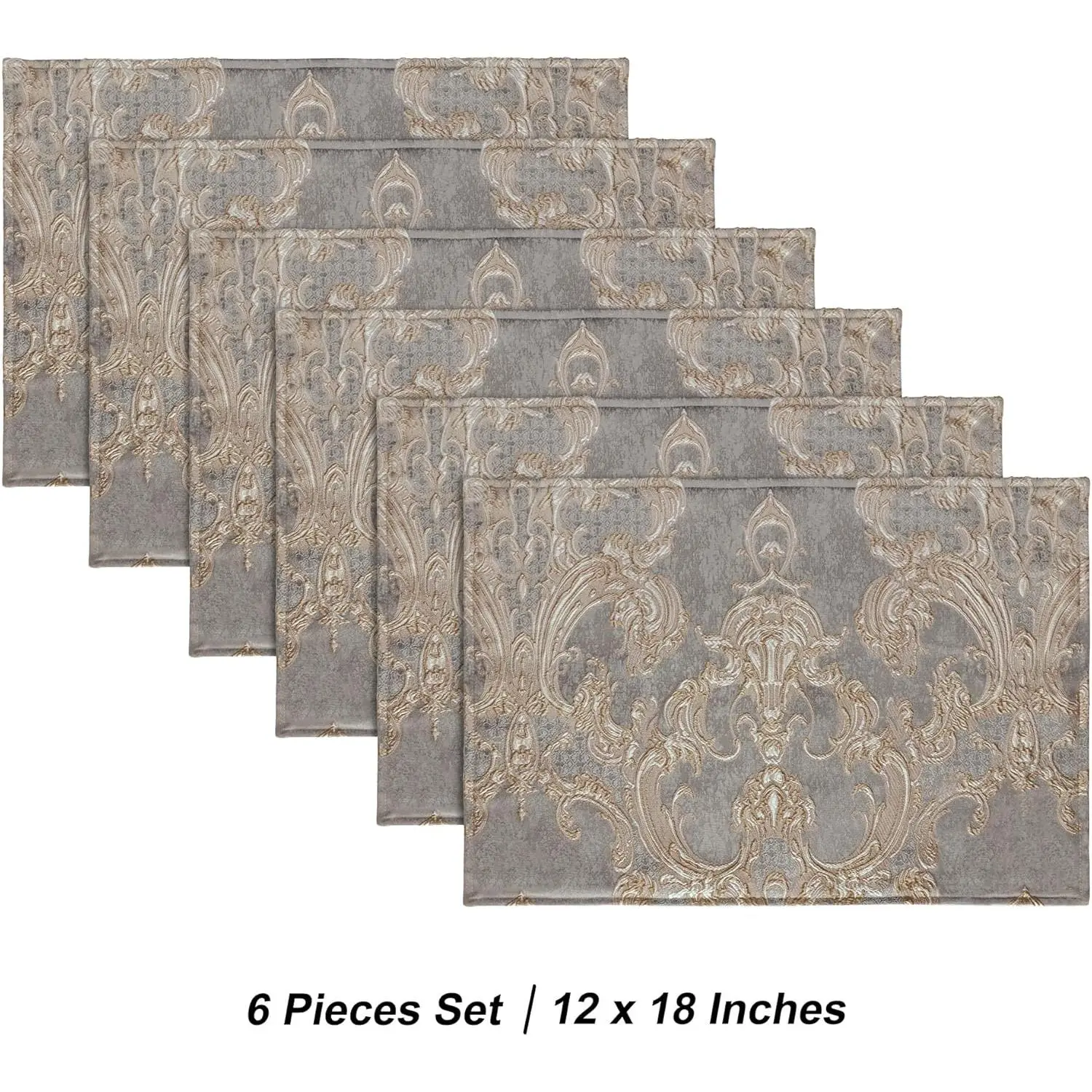 GORGEOUS TABLE PLACEMATS: These stunning and opulent Jacquard Dining Table Placemats in the traditional elegant style will create a lavish and chic atmosphere for your kitchen table.No matter in terms of visual effects, laying effects or tactile experience, they are far superior to ordinary table mats in the market.DIMENSIONS: 12" x 18", 6 PCS in package, large enough for any plate or bowl.Protect your table from scratches and stains with these durable placemats.Perfect for various kitchen and dining room decorations, offer you more fun in coffee time, mealtime.TOP QUALITY MATERIAL: Made of advanced synthetic fiber, our Luxury Textured Table Place mats are soft, comfortable and heavy.Selected ultra delicate high-grade suede as the back material, non-slip and wrinkle resistant.EXCELLENT WORKMANSHIP: Combined with the weaving process and hand-made crafts,you can feel the great quality from every neat and tight stitching.Double edge wrapping and 300d high-density yarn count make these dining table mats more refined and durable.MULTI-USE & CARE: Great choices for family daily use, holiday, Thanksgiving, Christmas, housewarming, wedding, anniversary, birthday, and any other special occasions, etc.Hand wash recommended, iron low.If you have any questions, please feel free to contact us, we are willing to assist you.