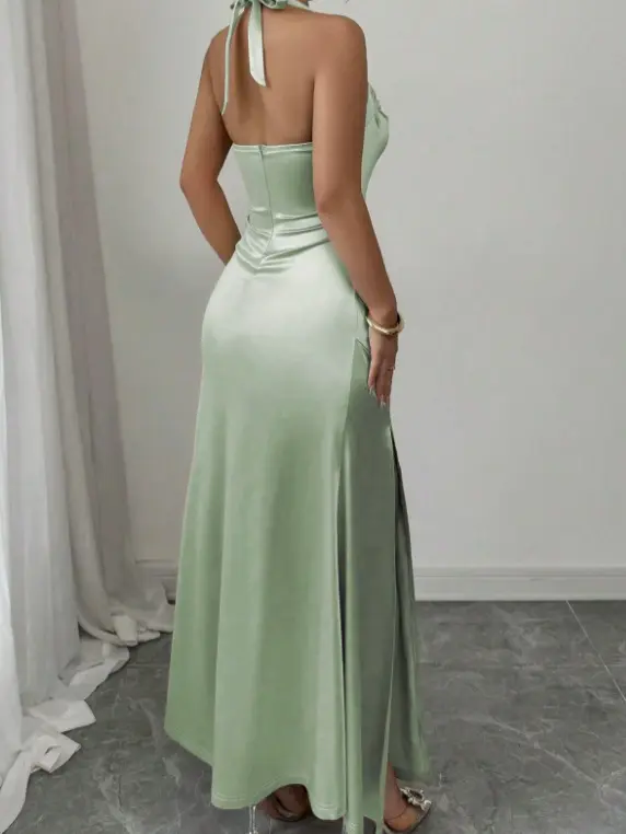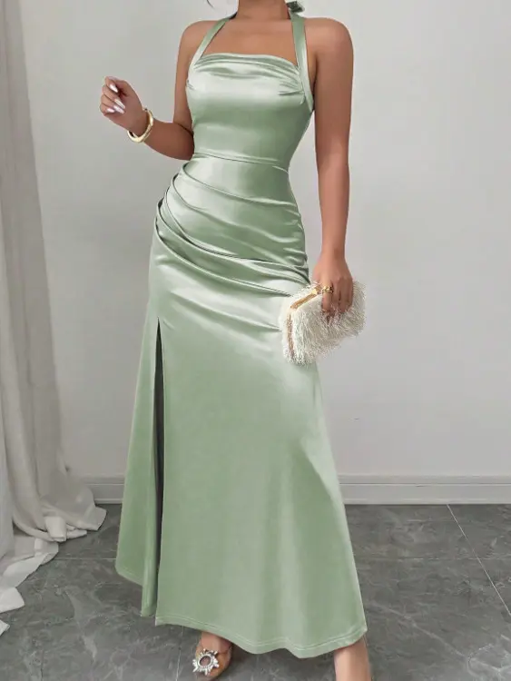 SYHAN 2026 Latest Women's Luxurious Satin Halter Neck Ruched High-Slit Dress - Fitted Evening Gown for Weddings, Proms, Galas| Machine Washable Pure Color Formal Party Dress, Wedding Guest Gown sorority