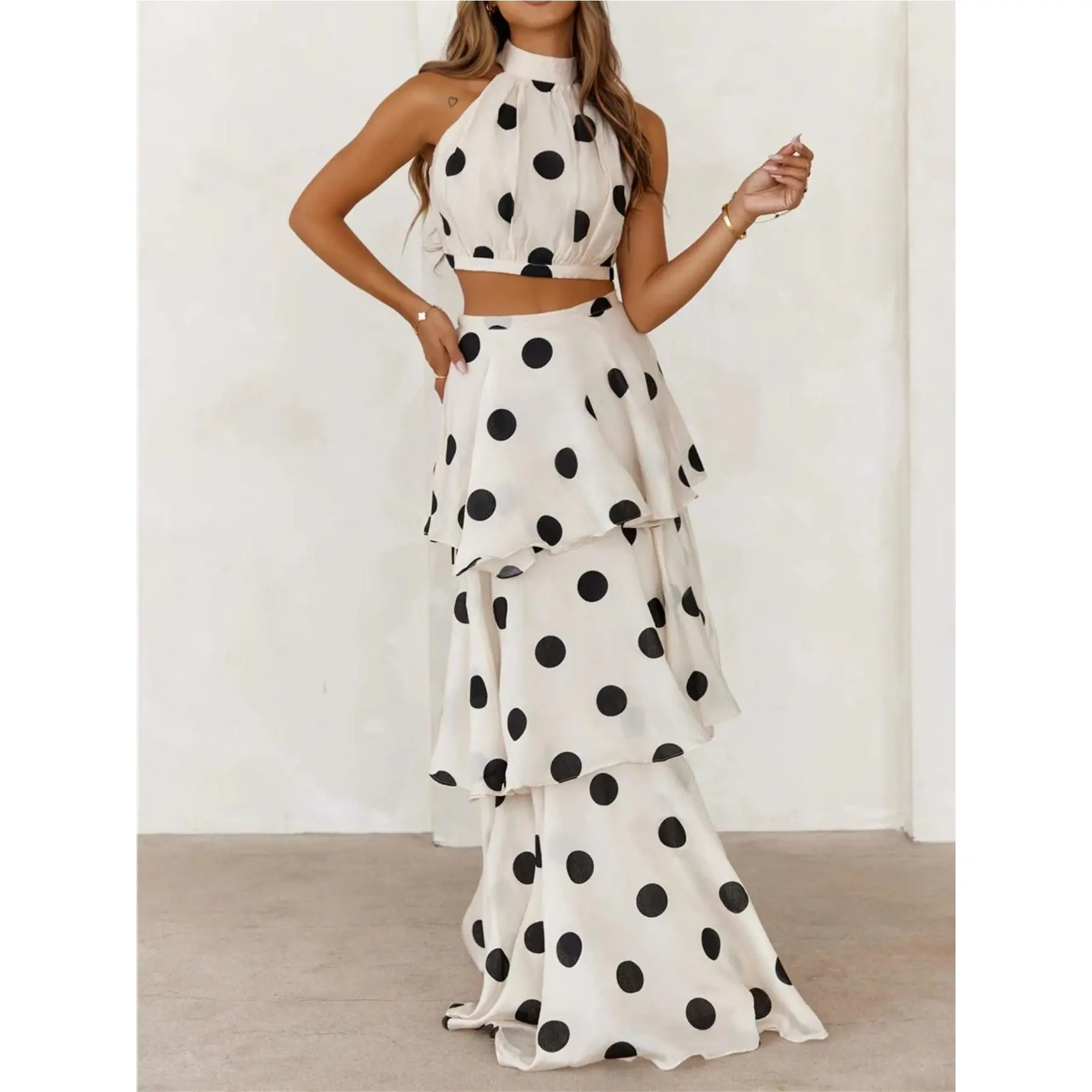 This 2pcs set features a black-white polka dot halter sleeveless dress and skirt. Perfect for mature leisure gatherings, it's made from 100% polyester. The set includes a dress and a skirt, both with a polka dot pattern. The dress is sleeveless with a neck holder collar. The skirt is a layered design, adding a touch of elegance. Ideal for spring/summer events.