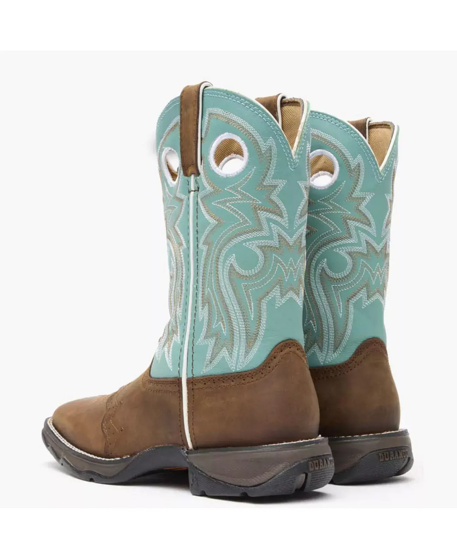 If you re looking for a comfortable, yet playful, pair of western boots to strut around town, then these Durango Brown Powder 'n' Lace Lady Rebel boots are perfect for you. While the cowgirl boots have all the classic western features, a dipped top with white piping, pull straps, a fancy stitched shaft and a square toe, the powder 'n' lace colored upper is a fun way to show off your style. The foot is made from brown full-grain leather with a classic saddle vamp to create a nice contrast. You can wear the women s western boots with a great pair of jeans or with a flowing skirt and it will look amazing. There are pull loops to make getting the boots on an easier process. You also can walk around in these boots for hours because the lining is equally soft and comfortable. Most women buy footwear that s pretty but would never describe them as being comfortable. You get the best of both worlds with these cowboy boots for women.