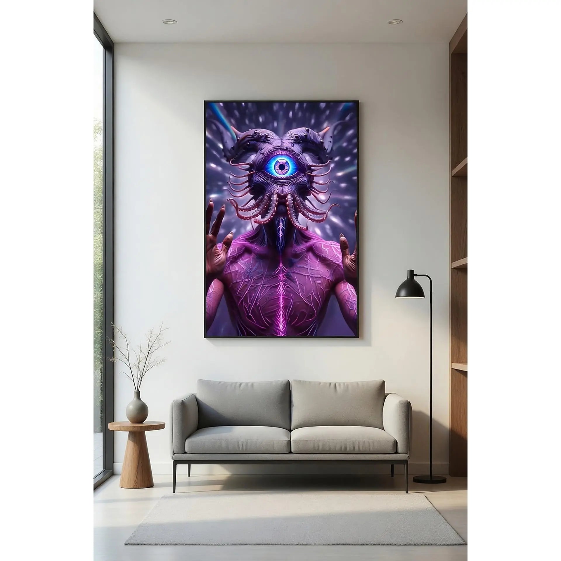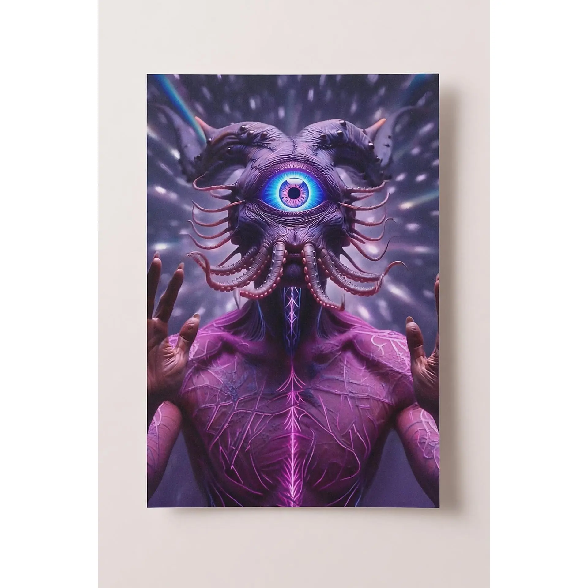 A neon witness stares through the veil. Eye of the Signal is a bold, symmetrical piece of alien vision and cosmic intensity, pulled from an original Quetopian world and made for walls that want something stranger.