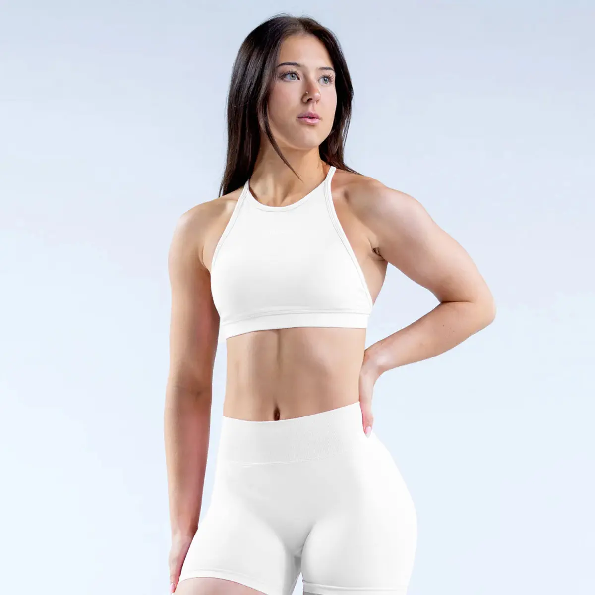 Designer dupe Dynamic High Neck Backless Sports Bra High halter neck Strappy cross back Open back design Subtle contouring Ribbed underband High stretch & durable fabric Medium support Removable bra pads