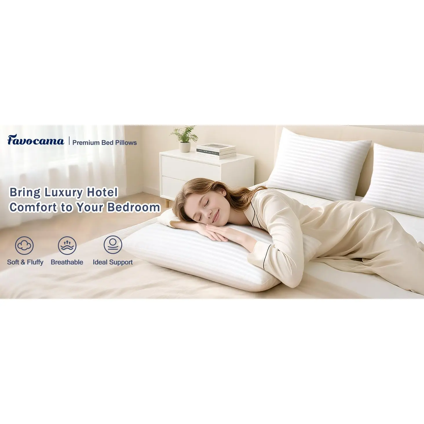 Ultimate Comfort: The silky smooth surface of the bed pillow caresses your skin when you sleep, and the soft & lightweight microfiber blends perfectly with the luxurious plushness of real down, so that when you get home from a busy day, you can enjoy a cloud of soft and fluffiness that lets you drift off to sleep in a comfort stateJust-right Support: Favocama bed pillows are each filled with 2lbs of premium down alternative microfiber.The filling is 7D premium hollow fiber for an optimal balance of softness and plushness with a quick 5s rebound.Our pillows for sleeping is finished with the latest jacquard stitching, which combines with the freshness and wicking technology for all seasonsErgonomically constructed for Most Sleepers: Favocama hotel pillows are wrapped in a generous amount of soft polyester fiber that provides enough cushioning to keep your head and neck snugly in place, and a scientific distance of 3-5 inches from the bed that conforms to the body's curves.Meet the different needs of side sleepers, stomach sleepers or back sleepers, it is customized for youNon-shifting design: The inside of the pillows for bed is made with strict down-fixing technology, the alternative down filling is evenly distributed and does not easily run out of down, perfectly shaped and non-shiftingEASY CARE: Sturdy stitching increases the lifespan of king pillows and prevents the filling from leaking out. The dimension of king pillows set of 4 is 36"x20" which can go straight into the washer and dryer. Once out of the box, grab the pillows by the sides and gently shake and pat the pillows to fluff them up