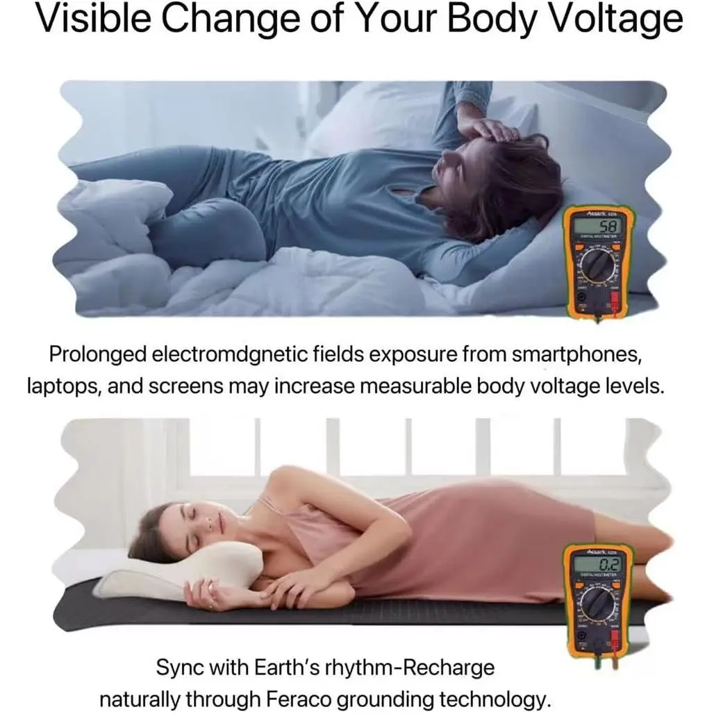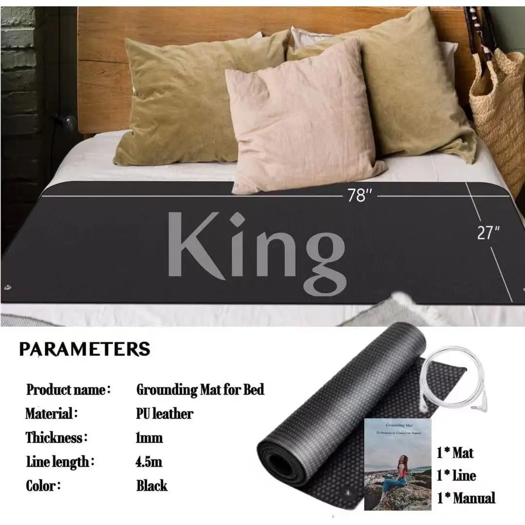 Premium Conductive Materials - Crafted from tear-resistant PU leather embedded with conductive carbon.The perforated design ensures lightweight breathability, eliminating any sticky or stuffy feeling even in hot summer.Safe for all ages, including children and those with sensitive skin.Natural Grounding for Sleep Support - Connects you to Earth's natural negative electrons through your mattress, helping to promote better sleep quality and stress support.Many users report positive experiences with consistent use over time.Individual results may vary based on lifestyle and usage habits.Easy to Use: The package contains grounding sheets *1, grounding cord (15') *1, and user manual *1.Simply Place the grounding mat on any place you want to use, and the adjustable straps can help you to aviod the mat slip.Connect one end of the grounding cord to the mat's metal button and plug the other end into a grounded wall outlet.Enjoy the recovery effect of the body of grounding.Easy Setup with Anti-Slip Design - Package includes grounding mat*1, 15ft extra-long grounding cord*1, and user manual*1.Simply place the mat anywhere you, secure it with adjustable elastic straps to prevent slipping, connect one end of the cord to the mat's metal button, and plug the other end into a grounded wall outlet for immediate benefits.Reinforced buckles help prevent shifting, even for active sleepers.Safety Protection with Lifetime Warranty - Built-in 100k ohm current-limiting resistor helps prevent electrical surges and lightning strikes. The grounding cord features tear-resistant construction for improved durability.We sincerely hope customers who purchase our grounding products are fully satisfied with both our products and services-this is our greatest pursuit. If you encounter any issues, please contact us through buyer messaging.
