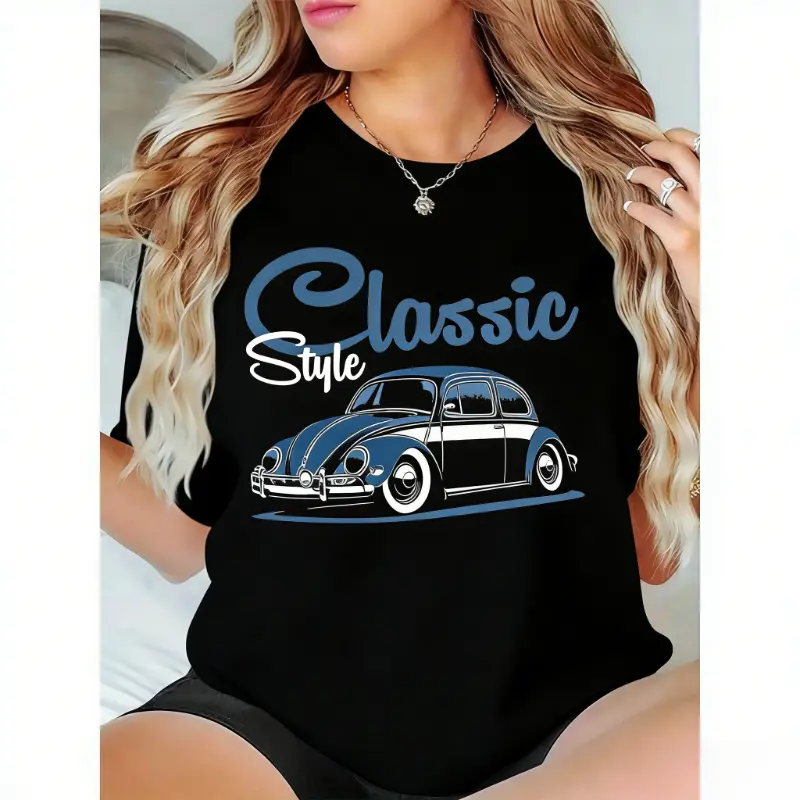 5. Women's Classic Car Graphic T-Shirt, Vintage VW Beetle Print with 'Classic Style' Text, Casual Daily Retro Fashion Top for Car Enthusiasts & Trendy Ladies
