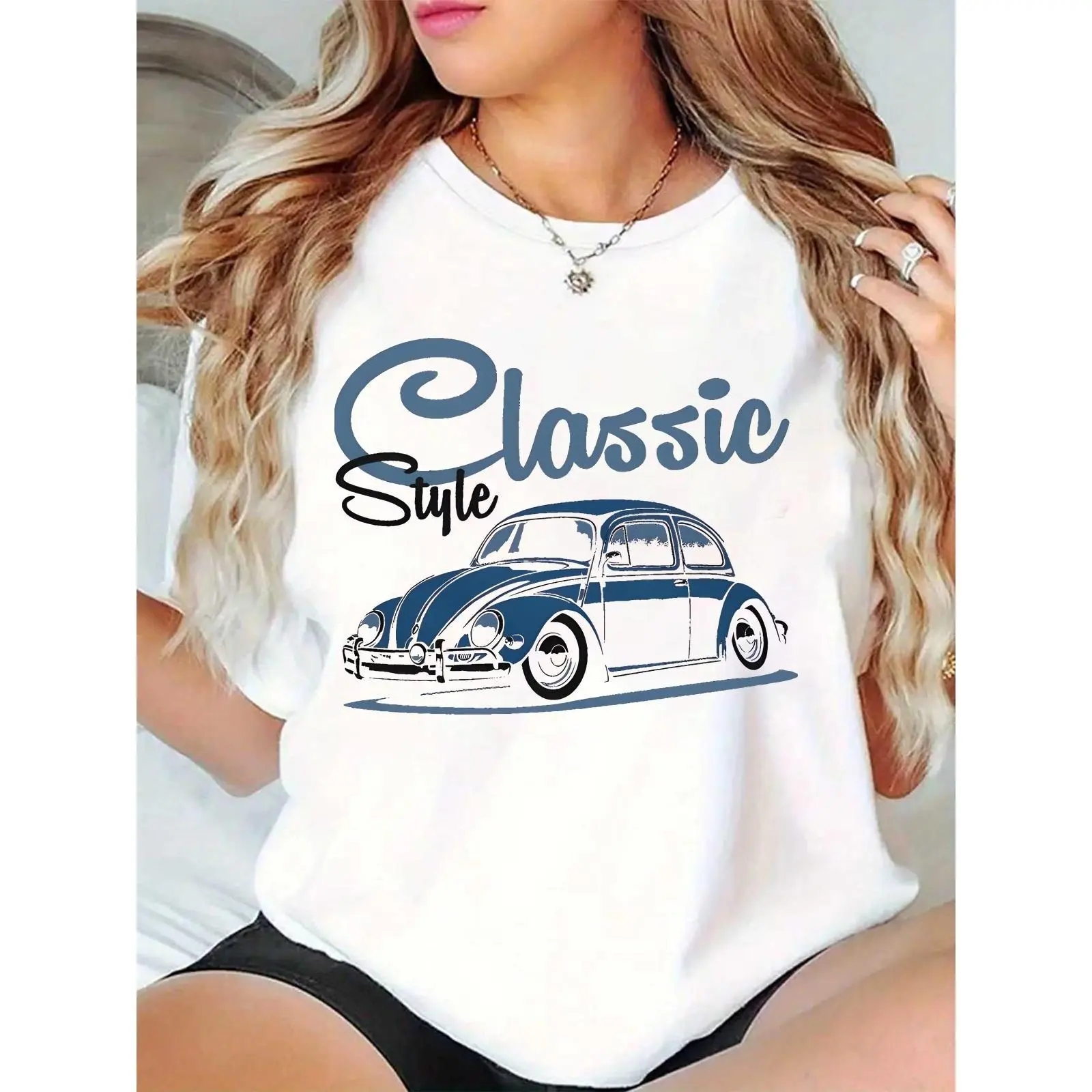 Women's Classic Car Graphic T-Shirt, Vintage VW Beetle Print with 'Classic Style' Text, Casual Daily Retro Fashion Top for Car Enthusiasts & Trendy Ladies