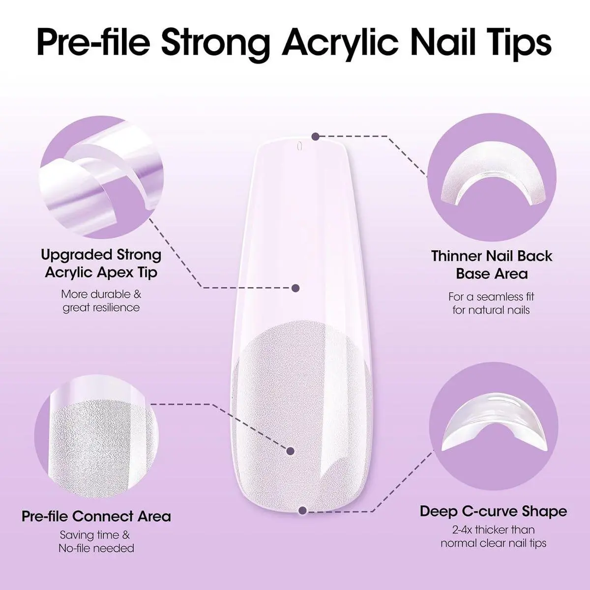 【Pre-Sculpted Perfection】Gellen pre-building acrylic nail tips are specifically designed for flat nails, featuring a pre-sculpted, pre-pinched, and pre-shaped design. With an instant apex and c-curve fully formed, there's no need for layering, filing, or shaping. Save time and effort with these ready-to-use nail tips for effortless nail construction.