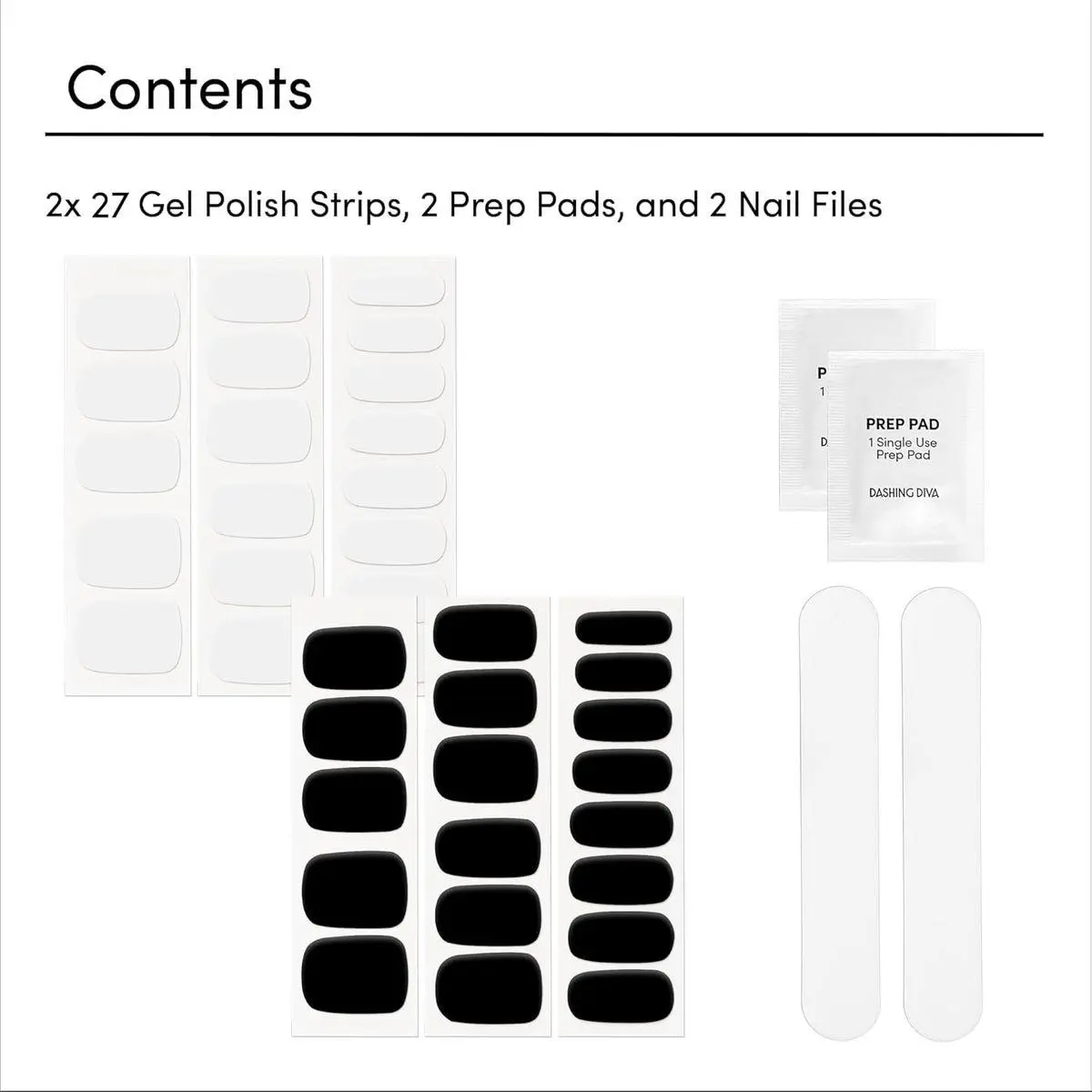 Includes: 2 x Gel Strip Sets. Each set includes 27 gel manicure strips, 1 prep pad, and 1 nail file