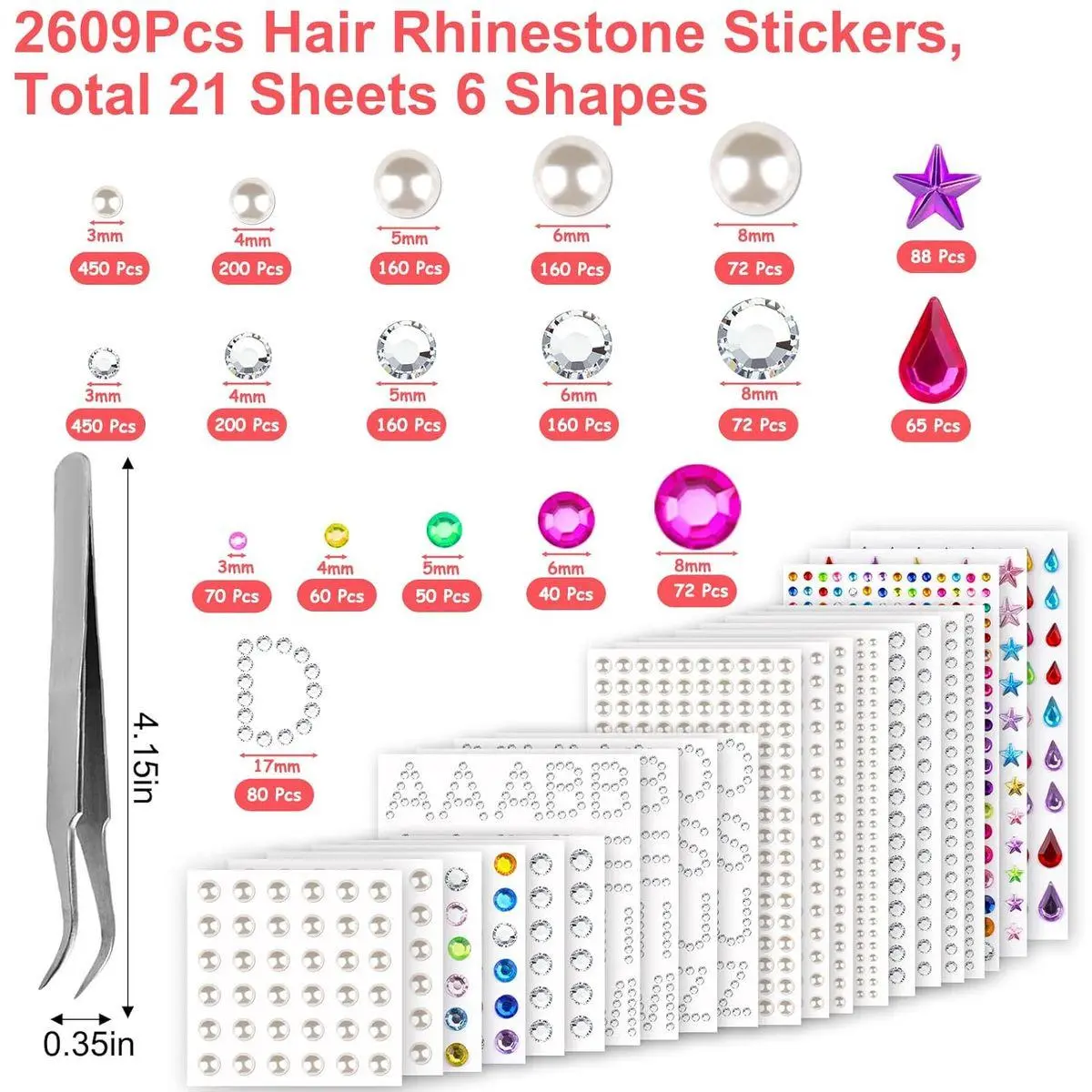 What You Will Get: You will get 21 hair jewels stickers with 2609 hair gems in total, 1042 pearl hair gems in 5 sizes, 1042 clear crystal hair gems in 5 sizes, 5 sizes of 292 full colour crystal hair gems, 1 sheet of 65 coloured teardrop gmes in various sizes,1 sheet of 88 coloured star gems in various sizes,4 sheets of 80 letter stickers. Plenty of quantity, various sizes, colours and combinations, and comes with a tweezer, with these, you don't need to look for other accessories.