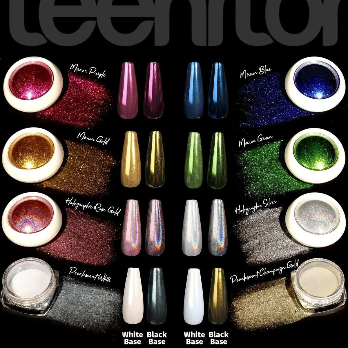Fine Texture Create Exquisite Mirror Effect: Teenitor chrome powder for nails is smooth and non-grainy texture, fine and requires only a small amount for each nail, easy to apply on various nail types like UV gel nails, acrylic nails, natural nails or false nail tips to create mesmerizing mermaid chrome effects and shining mirror effect. PAY ATTENTION: please make sure no wipe top coat not too wet for apply the powder, otherwise you will get a glitter effect not mirror