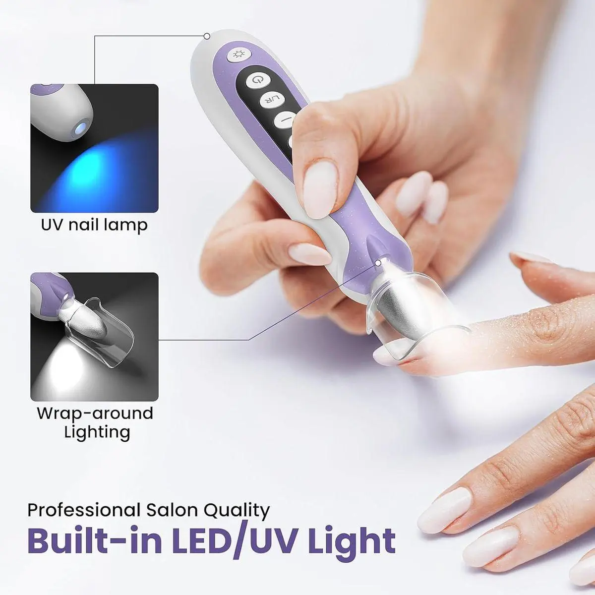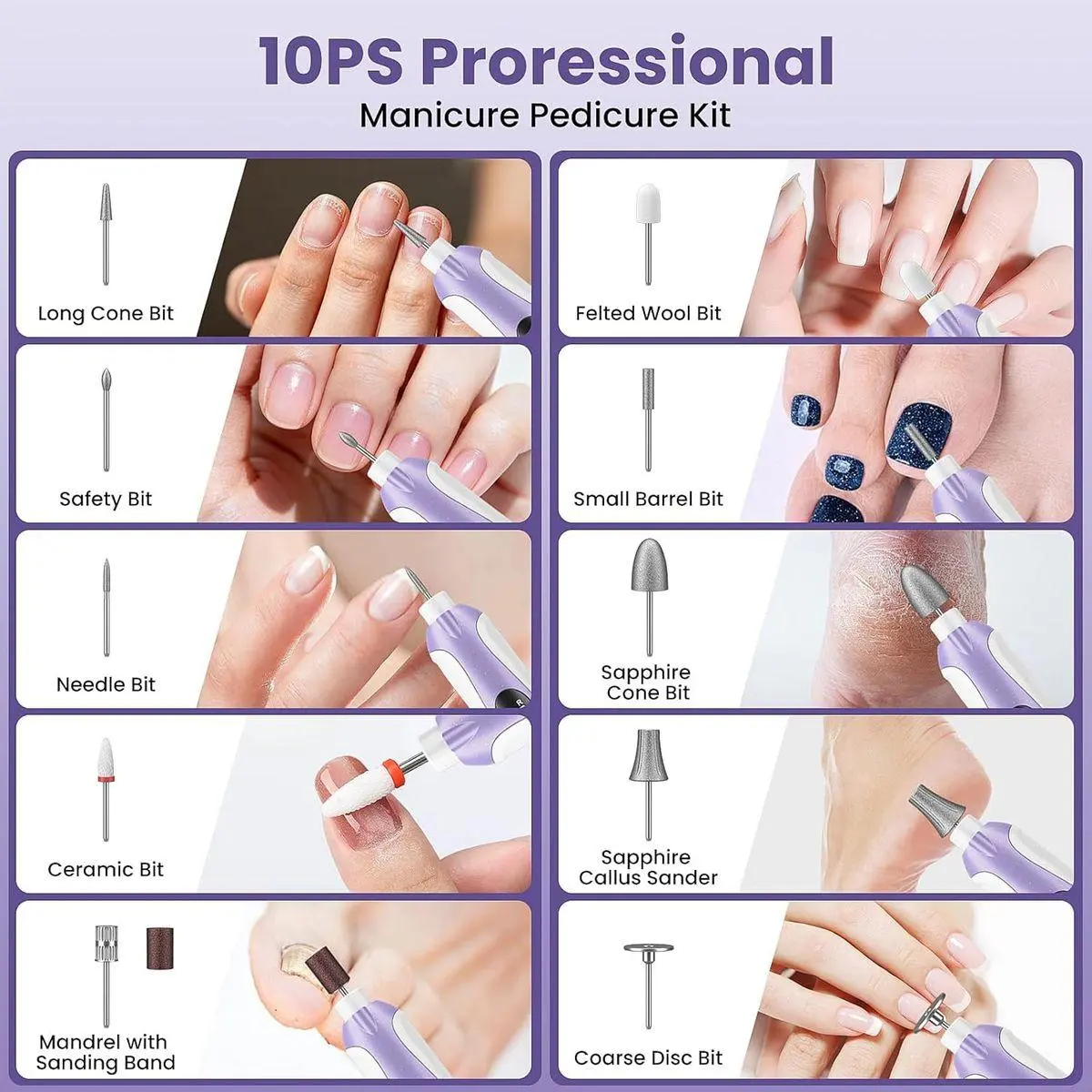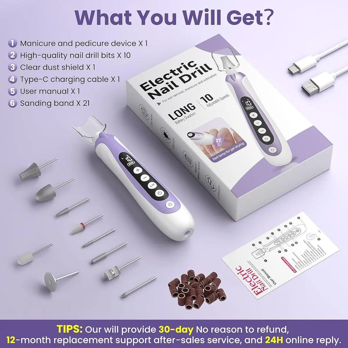 【Professional-Grade Nail Care System】 Achieve salon-quality results with this 10-piece nail drill kit. Includes specialized grinding heads and LED tools for filling, shaping, callus removal, and gel nail maintenance. The integrated lighting ensures precision, enabling professional manicures and pedicures at home.