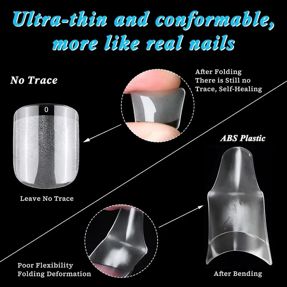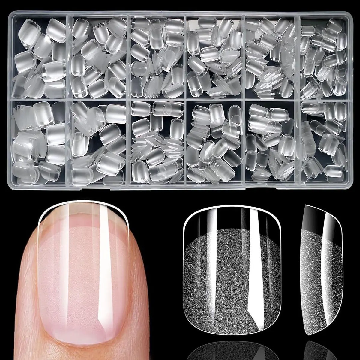 💅Designed Specifically For Nail Salons: Gel nails offer feature protective building gel finish,which is no different from professional salon nails.The smooth edge of clear nail tips have a more shallow curve, convenient to press on nails beds tightly, You can easily extend your nails and enjoy the fun of DIY nails. After wearing these short square nail tips , you can do anything you want without affecting your daily and work life, and these press on acrylic nails won't fall off easily.