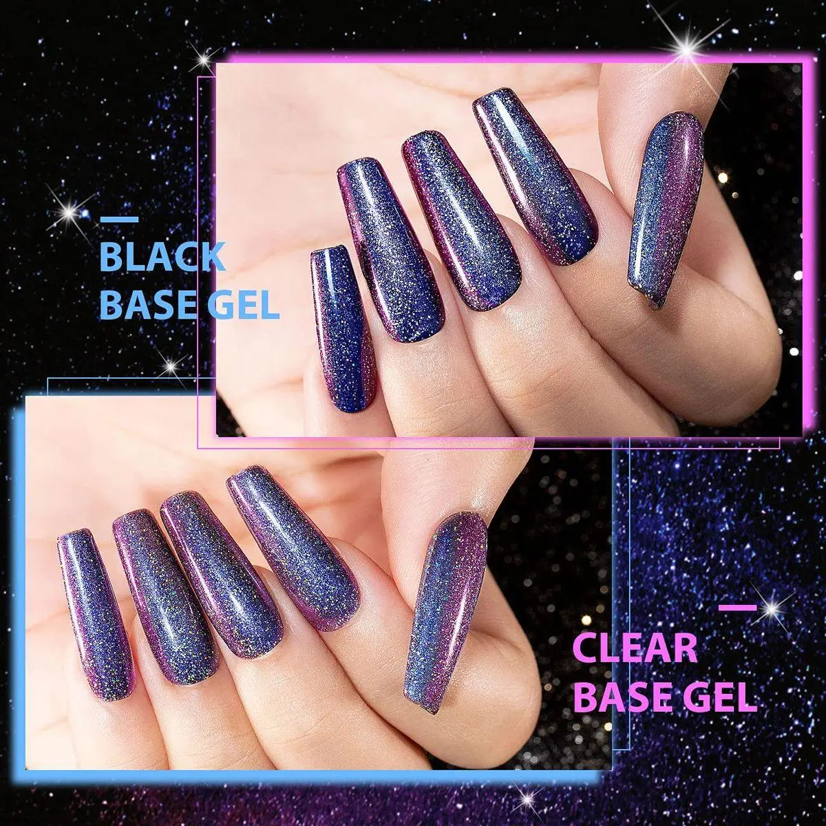 HOW TO GET A GREAT COLOR CHANGING EFFECT:We recommend applying on long nails will make the effect more obvious. In order to make a great effect we suggest use a black base,black shade tend to create a more fabulous effect.Due to various coating thickness and viewing angle of gel polish,the effect will be different