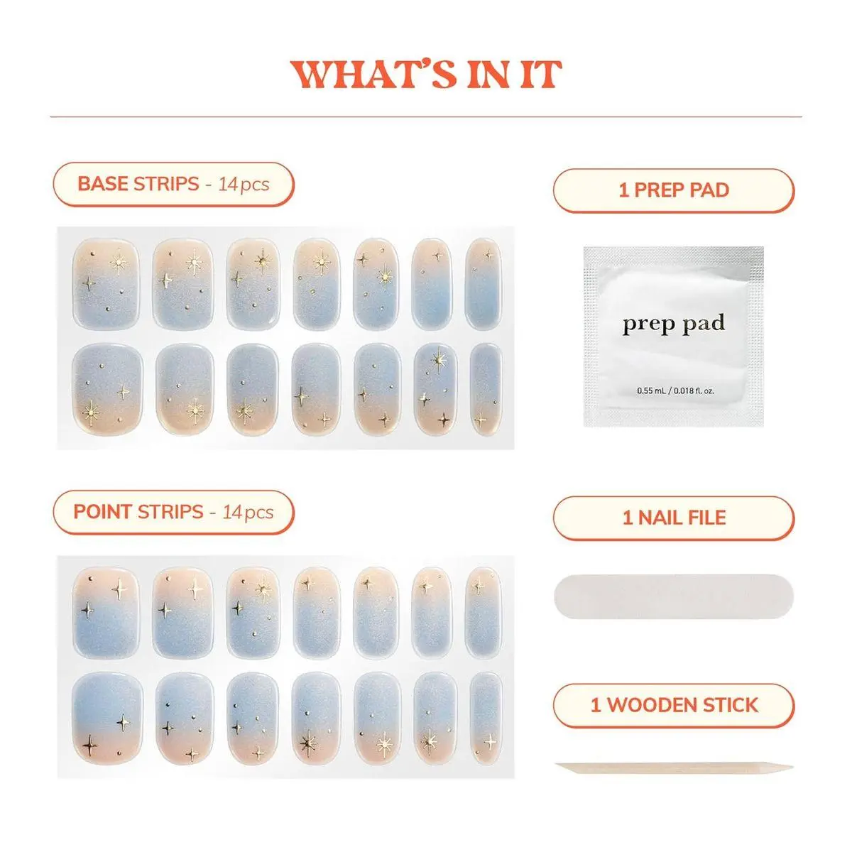 Included Components: Nail Strips, Prep Pad, Nail File, Wooden Stick