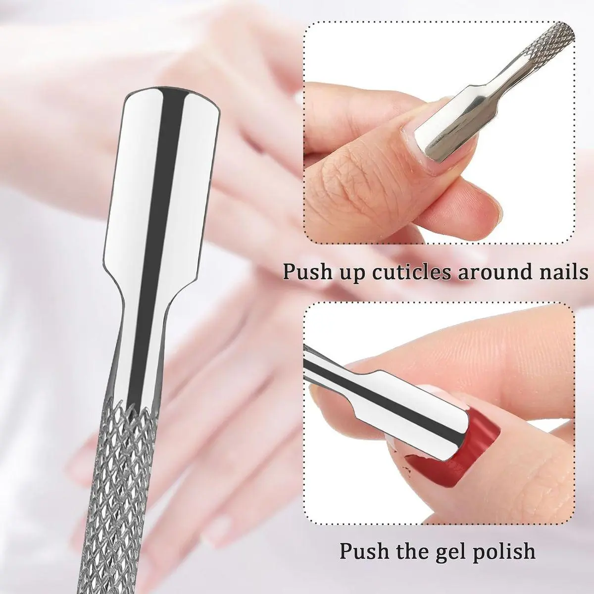 Dual-Headed Function: The dual-headed metal cuticle pusher includes a curved flat head for pushing back cuticles and a triangular head for removing dead skin and dirt from under the nails.