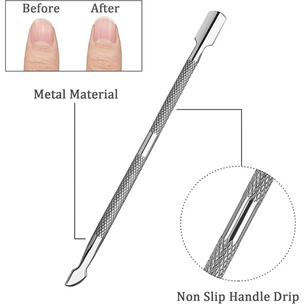 Ergonomic and Non-Slip Design: The metal cuticle pusher features an ergonomic design with a metal patterned grip for better control.