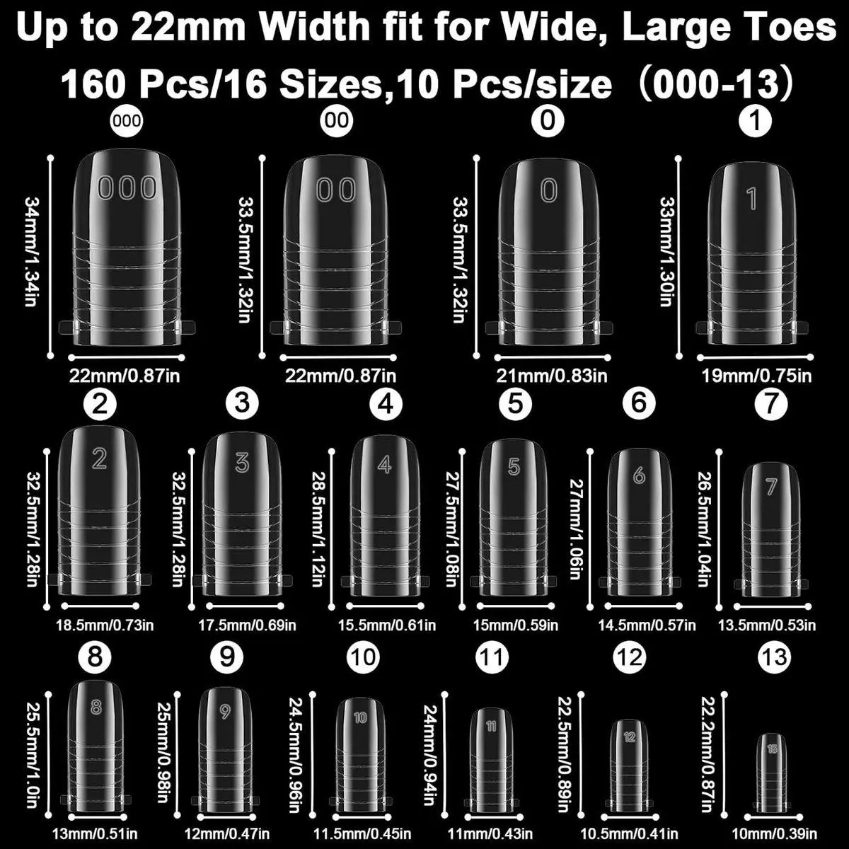 160 Pcs Toe Nail Forms Set: Includes 16 sizes of nail mold (10 pcs per size) to fit various nail shapes and lengths, perfect for DIY nail extensions at home or salon use.