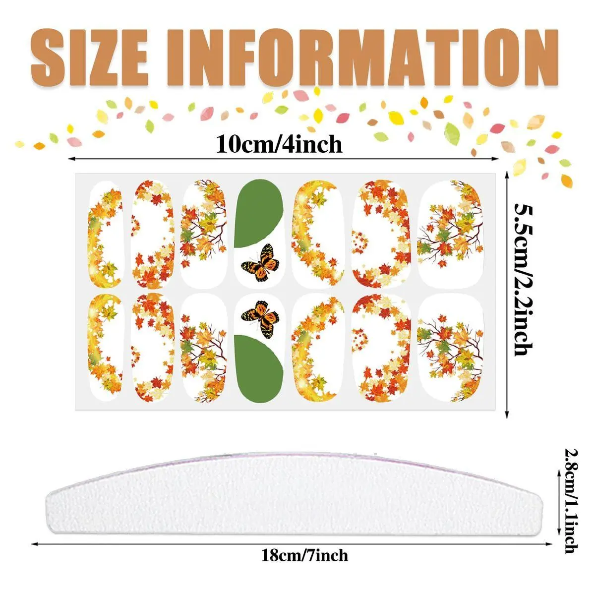 【Packet Content】:20 sheets Fall nail polish strips + 1pc moon shape nail art files, 20 sheets are with different fall season designs, each sheet strips has 14 tips with 7 different size to meet large-scale sizes of nails and replace in daily life.