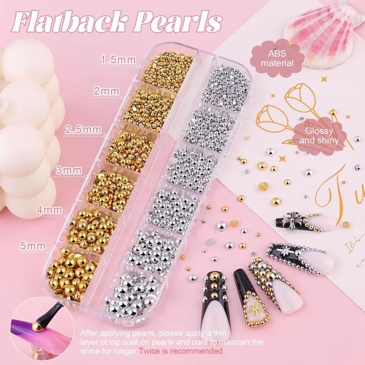 HALF ROUND PEARLS: 2 Color(Gold and Silver); 6 Sizes(1.5/2/2.5/3/4/5mm); Flat back pearls made of choice ABS material, with a smooth surface and exquisite shine make your nail design more dazzling and eye-catching