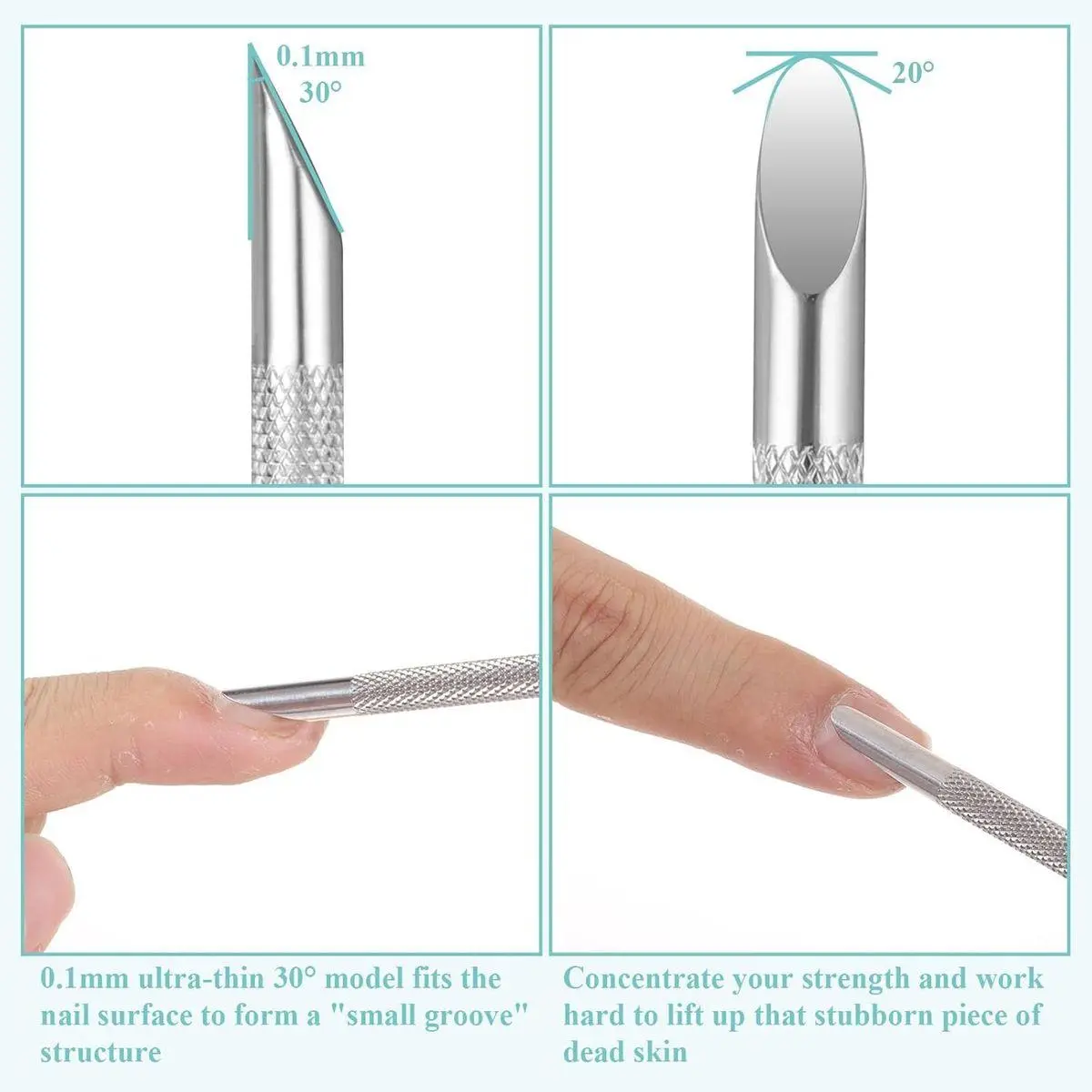 Precision Tools for Cuticle Removal: Our dual ended nail cuticle pusher with beveled head for lifting dead skin and loop pusher for gentle scraping, ensuring clean nails, nice dual ended cuticle remover for comprehensive nail care.