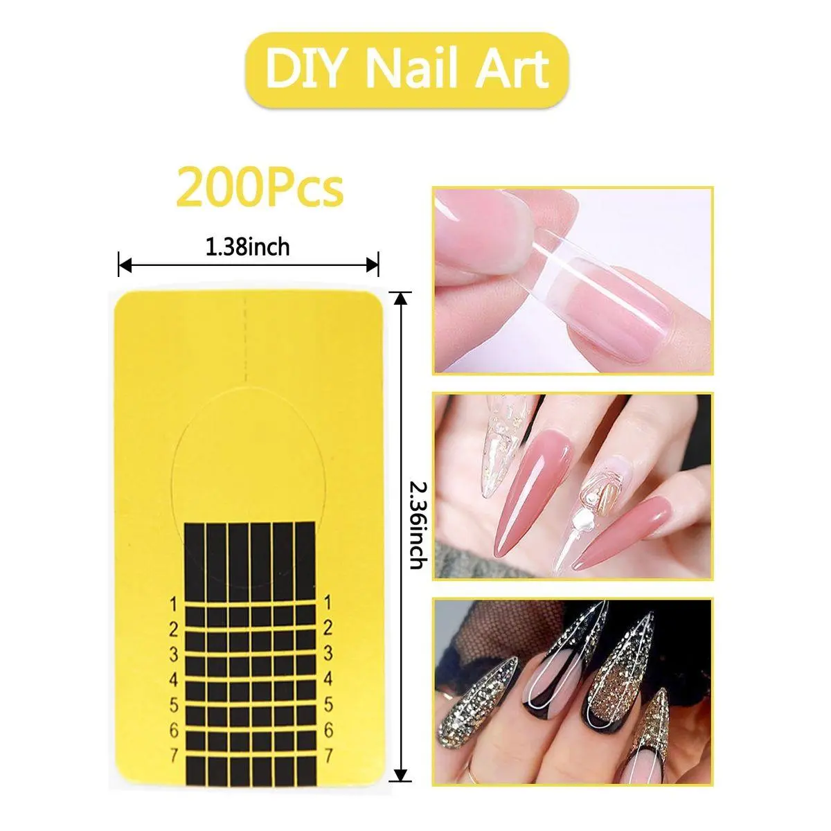 Nail Extension Forms Size: Total 200pcs nail extension stickers, each acrylic nails guide is about 2.36 x 1.38 inch. Adjustable size to fit for all fingers. With length and numbers marked, each nail stickers for acrylic nails can provides an accurate guide for making your pretty nails. Helps to avoid the nail polish to stain your cuticle and fingers.