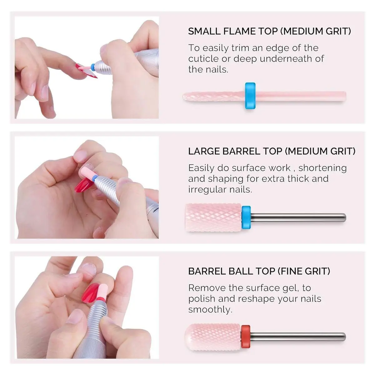 Multifunctional: 5 different shapes and sizes, a coarse torch cylinder bit, medium - large barrel and small flame bits, fine - barrel ball and umbrella bits. You could sharpen, grind, neaten, carve, smoothen, polish, and reshape gel and acrylic nails very quickly and efficiently, usually on the lowest setting before redoing the manicure or pedicure.