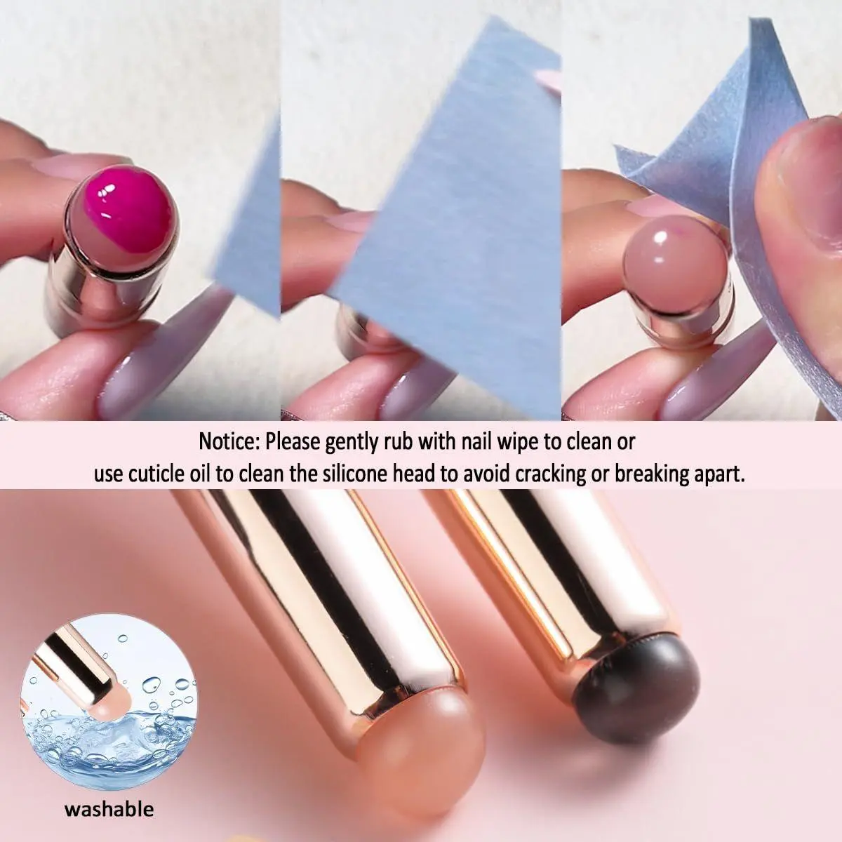 【How to clean】After using the brush,you can clean the brush head with cuticle oil or clean water,which will not do harms to the silicone brush head.
