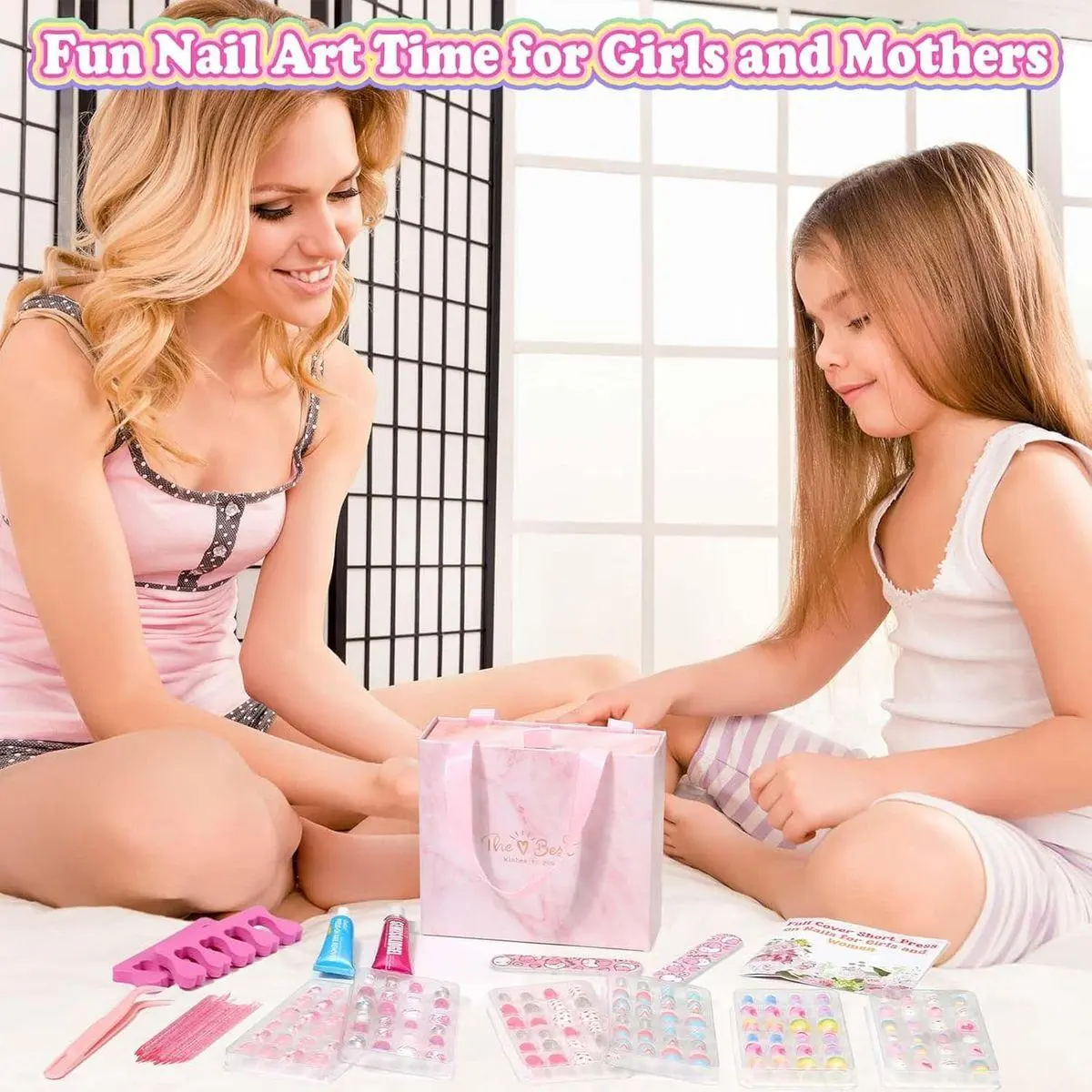 Kids Press on Nails Set for Girls: The kids fake nails kit contains 144 pieces girls false nails with sticky tabs, 10g nail builder glue and 10g glue remover, 10 nail art sticks, tweezers, nail files and the toe separator. Open the exquisite gift box, and you and your child can instantly enjoy a delightful nail art experience together!