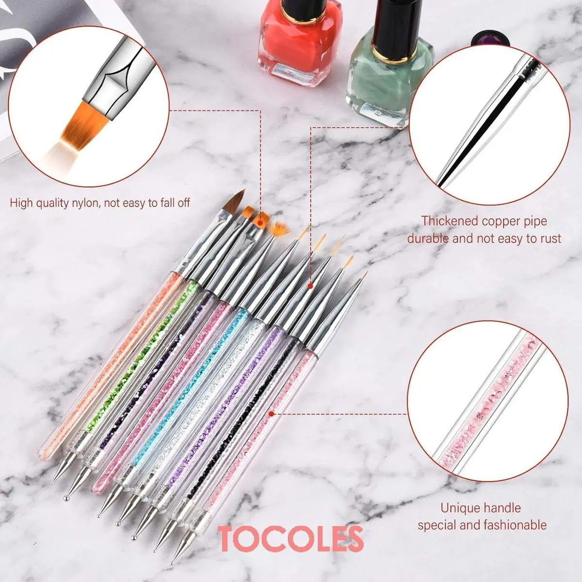 [DOUBLE-ENDED DESIGN] - 7pcs out of the 9pcs fine tip nail detail brushes are equipped with 2 different ends, convenient for you to draw different patterns. Perfect to create your own DIY nail style as you like