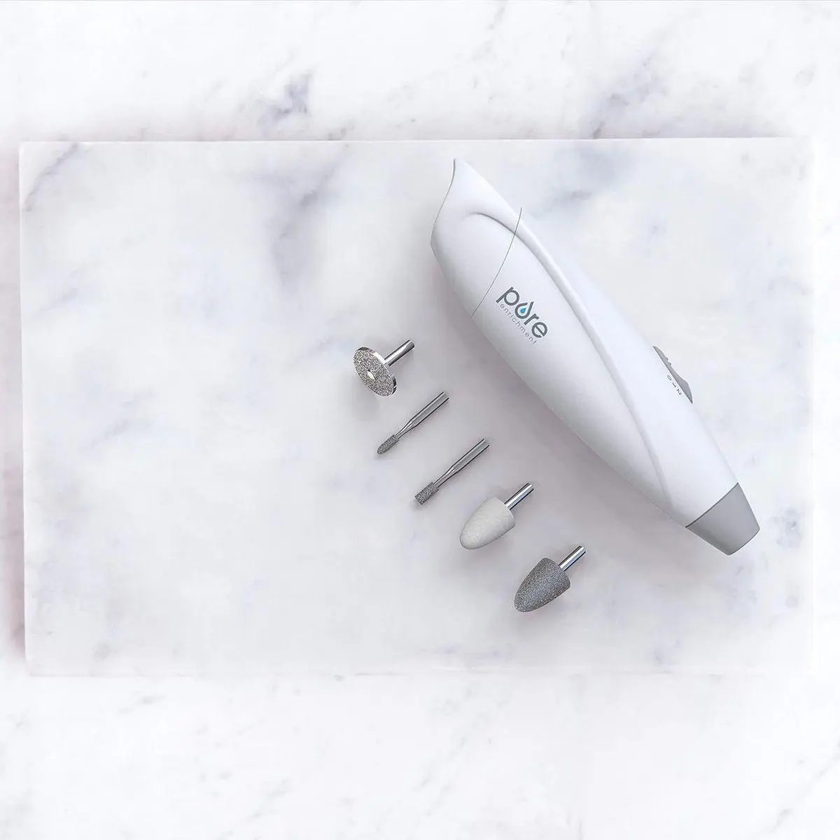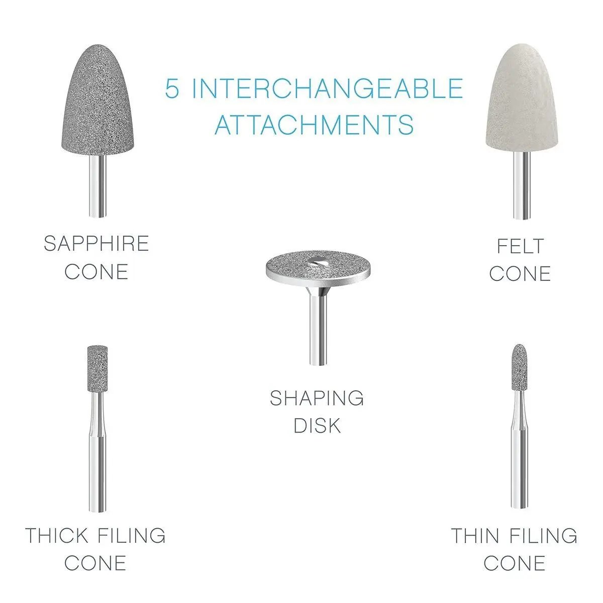 5 Interchangeable Attachments: Includes a sapphire shaping disc, sapphire cone, thick filing cone, thin filing cone, and a felt cone for buffing nails to a shine