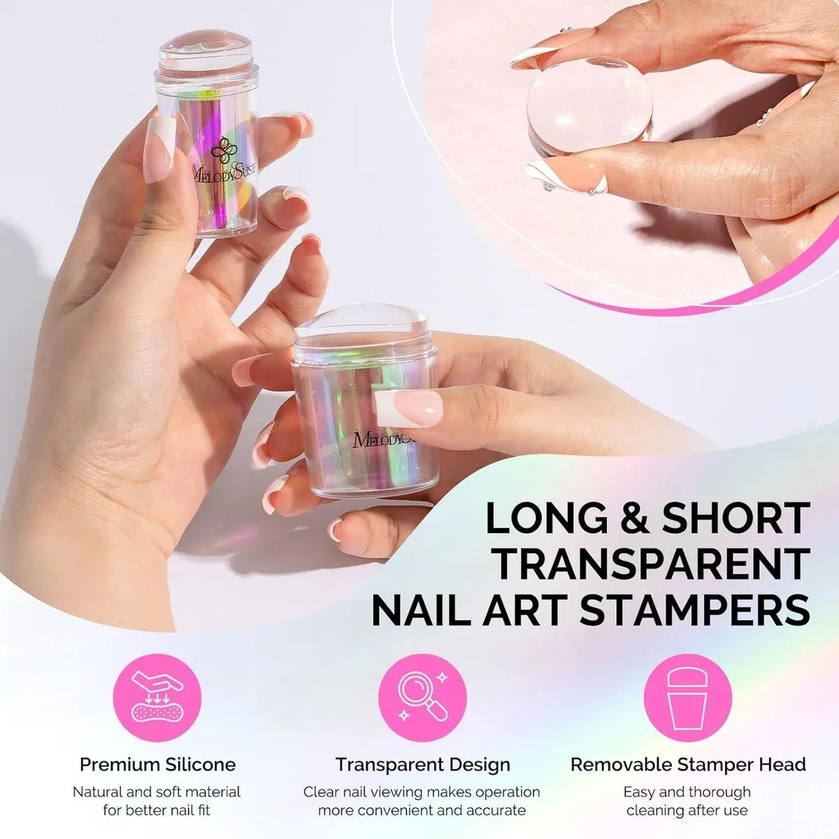 Easy to Use: MelodySusie silicone nail art stamp design allows you to easily see your operation when you are doing a manicure. It is easy to grip the stamp and pick up the pattern from the plate. You can see how the patterns transfer to your nails, making it easier for you to create the manicure you want.