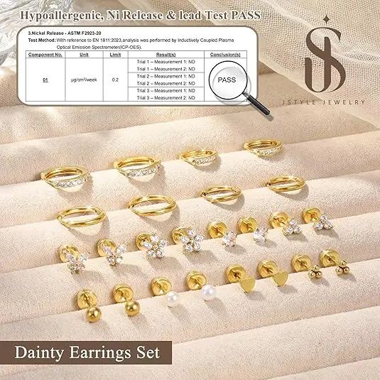 This 12-pair gold earring set is the ultimate jewelry upgrade for anyone with multiple piercings. Featuring 8 pairs of flat back studs and 4 pairs of huggie hoop earrings, all crafted in hypoallergenic 316L surgical steel with a gold plating and cubic zirconia accents — it's the set that goes with everything, every day.