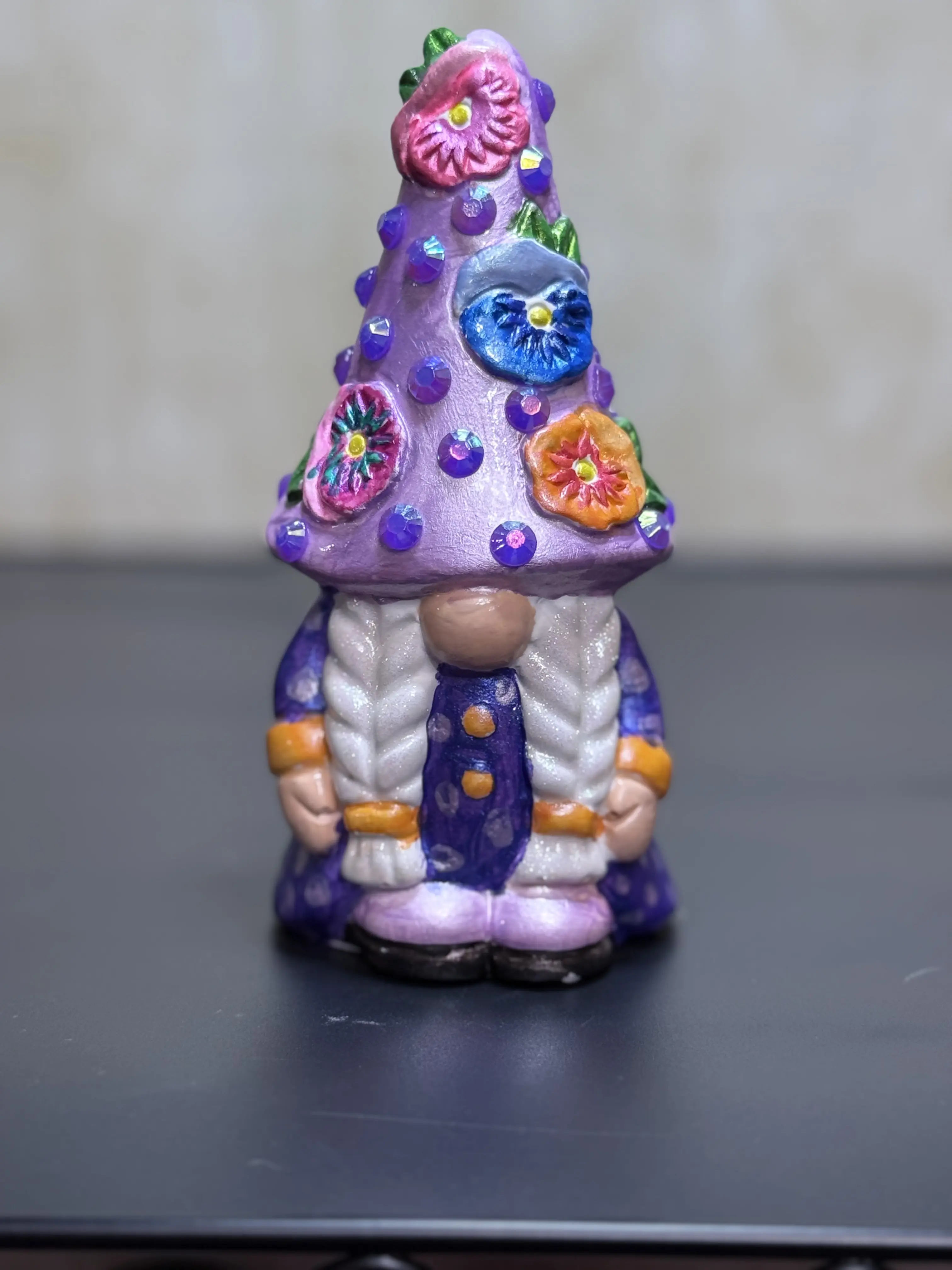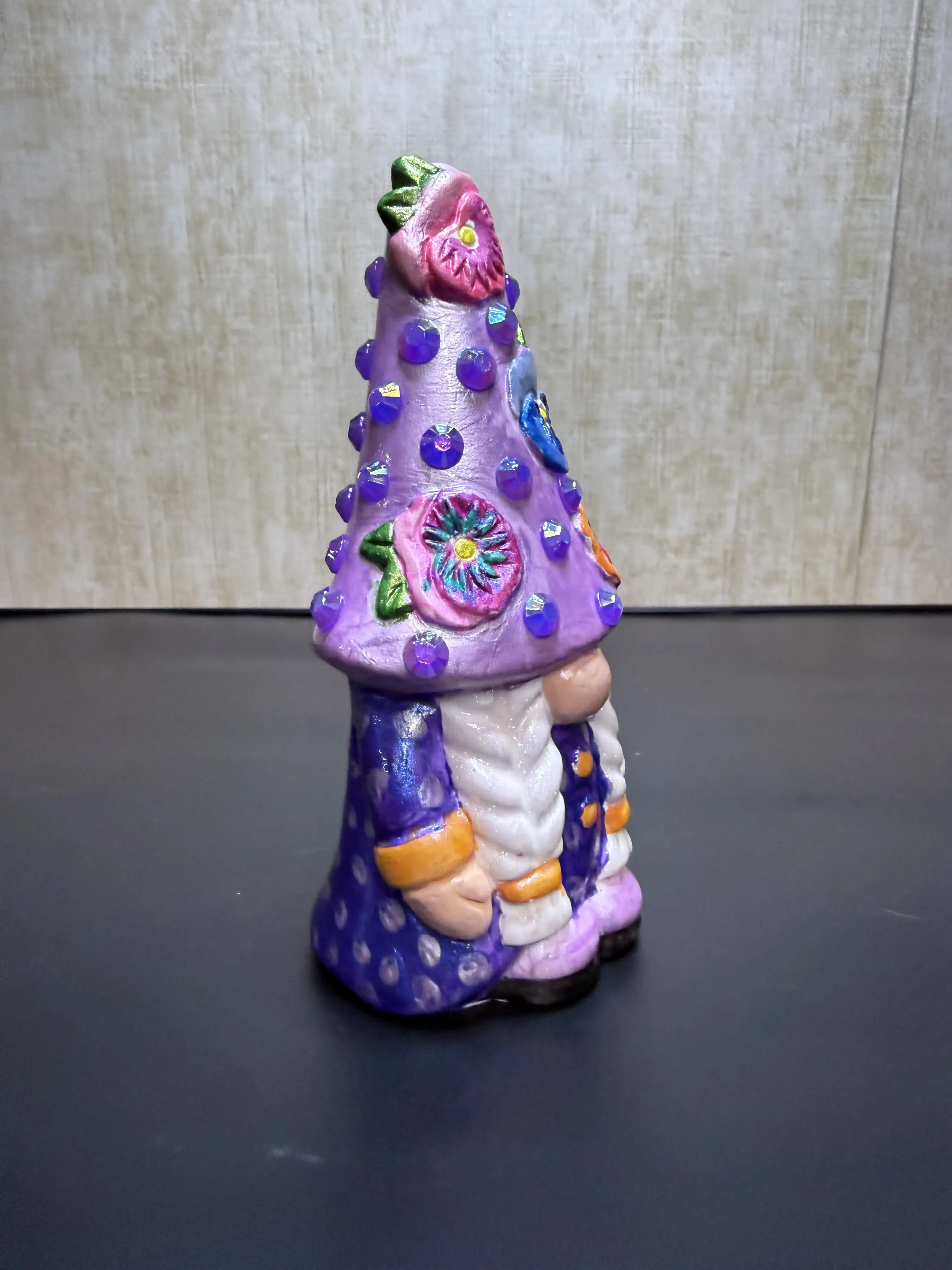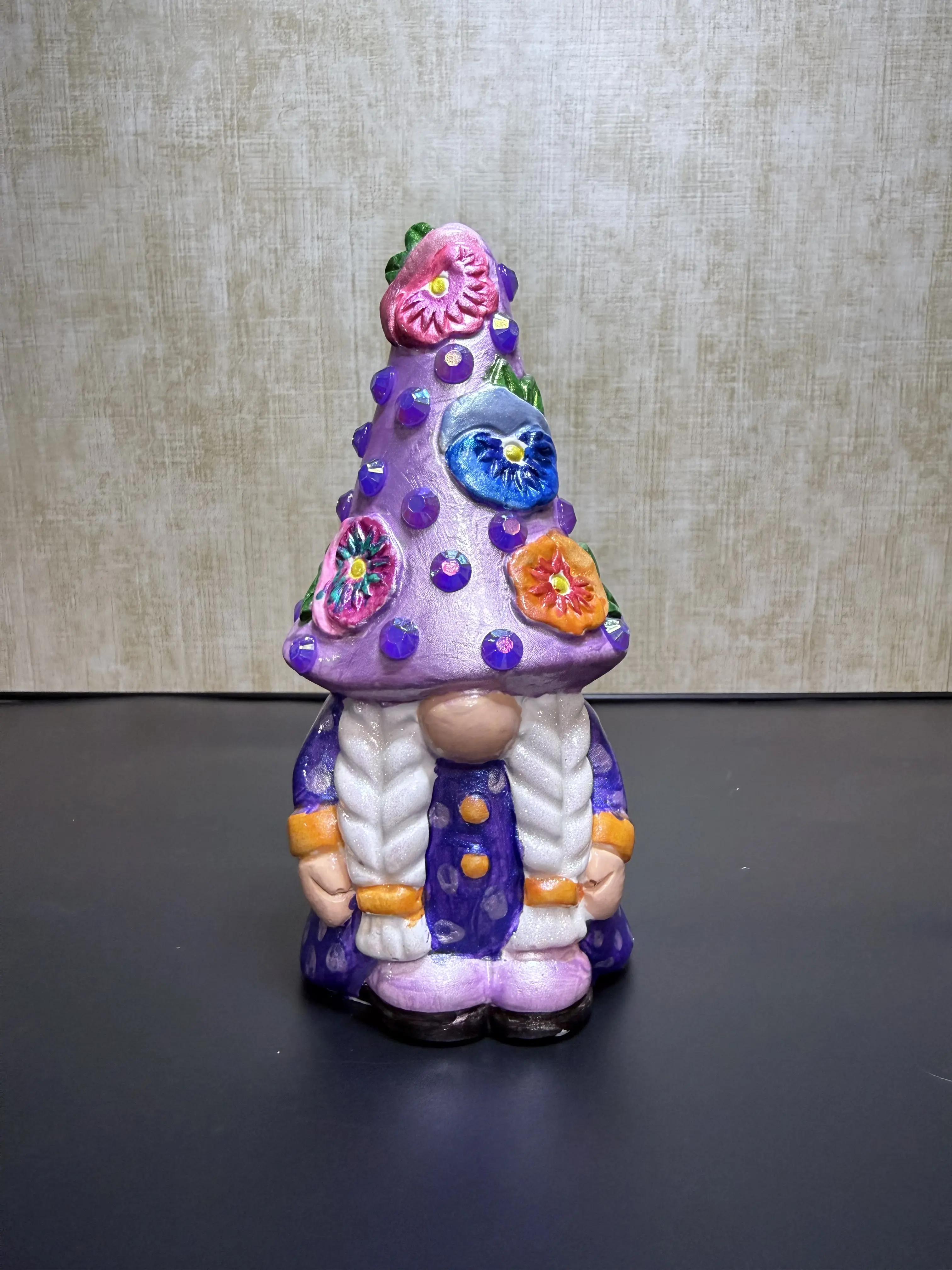 This one-of-a-kind hand painted gnome brings vintage bohemian charm to life with rich color, floral details, and sparkling gemstone accents. Designed with hand-applied gems and shimmering paint, this collectible piece has extra depth, texture, and shine that makes it a true standout.