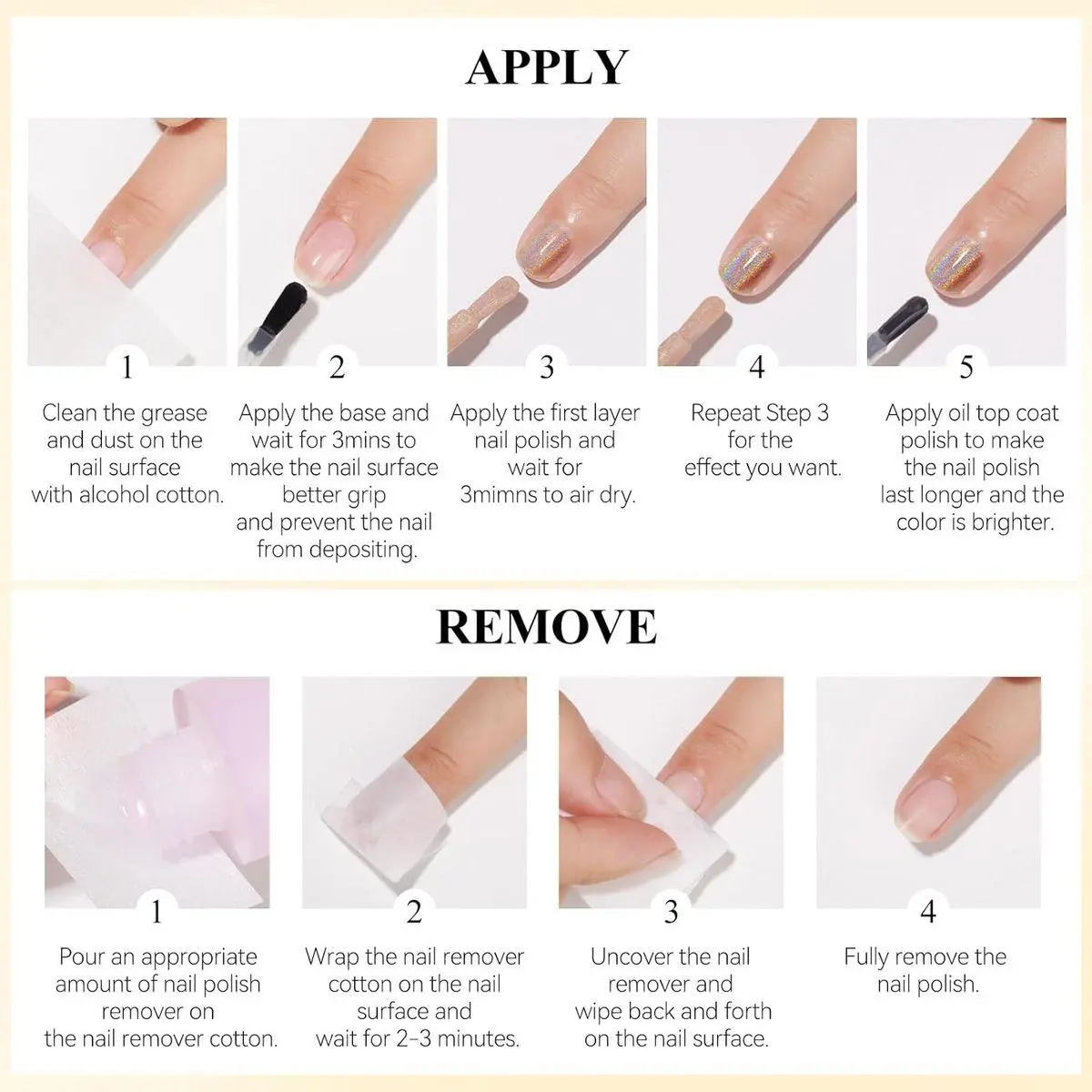 Strong Coverage: Only a small amount fast drying nail polish can have a great effect; It is applied on different base colors to have different effects, and can also be applied on different