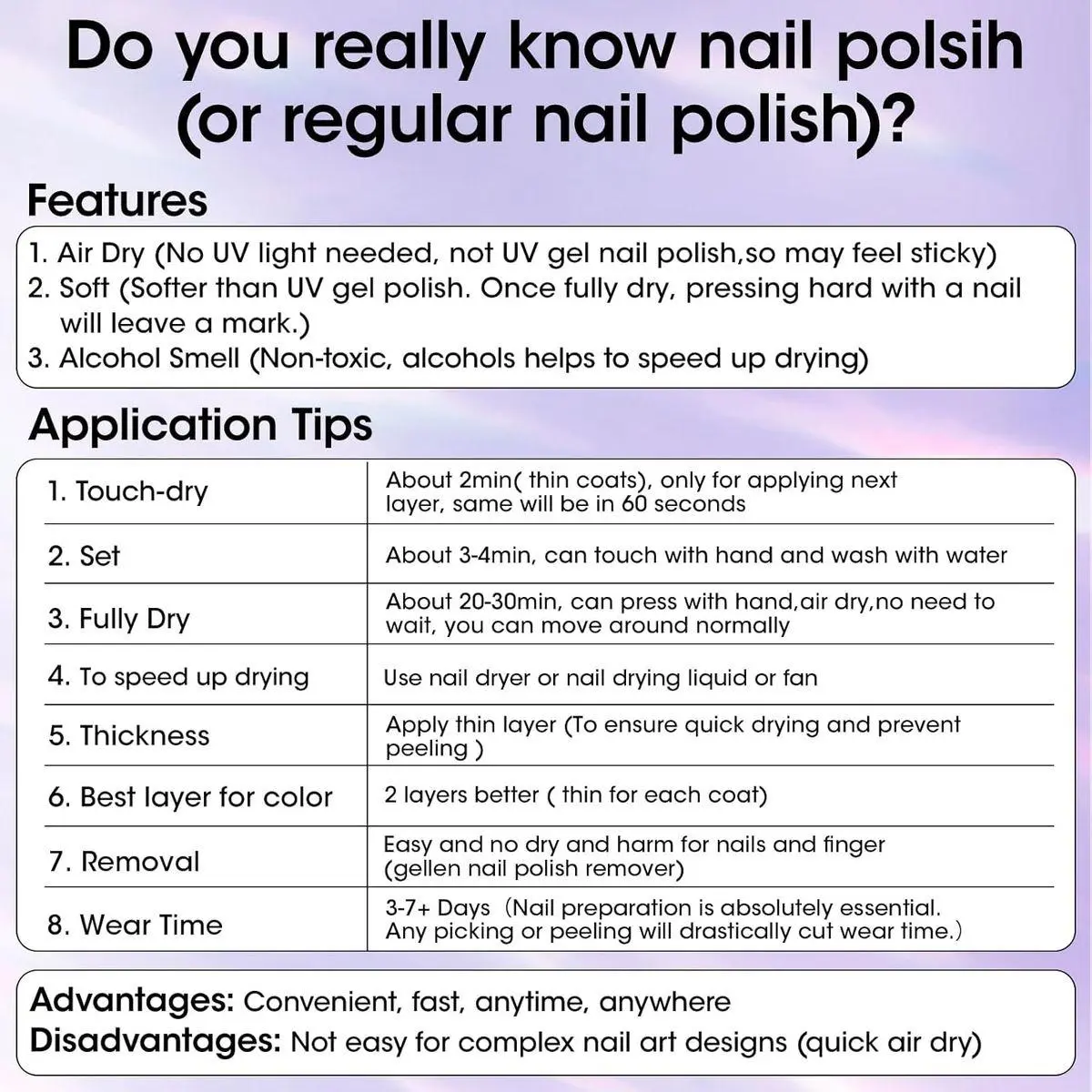 Quick Air-Dry – No UV lamp needed, dries fast. Alcohols help to speed up drying, but the resulting alcoholic odor is non-toxic