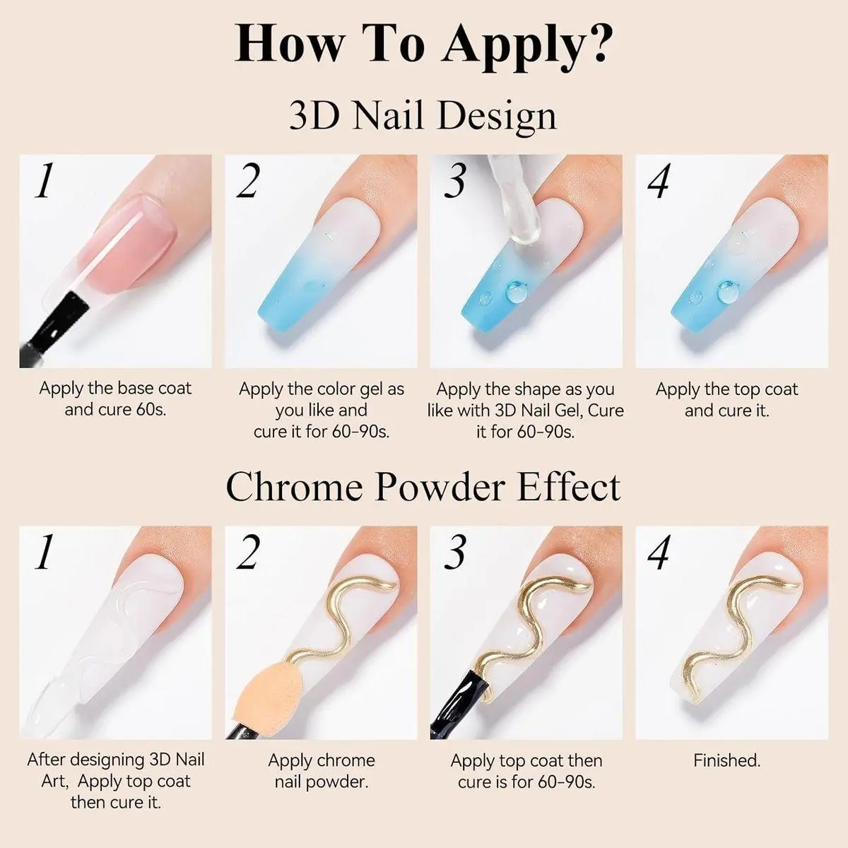 Notice: 1. The 3d gel requires applying a base coat and top coat; 3. Need to be cured under UV/LED lamp for 60-120s; 4. Low temperatures may cause the gel to harden, please soak the gel in warm water(about 140℉) for 5 min