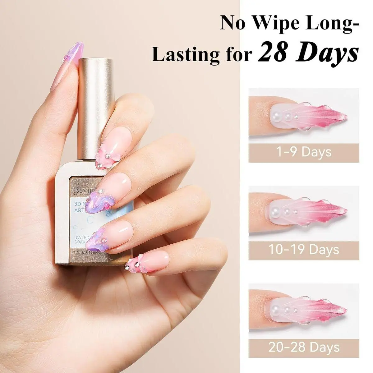 28+ Days Long Lasting: Bevimee 3d nail charm gel is easy to shape and cure quickly, enjoy salon-quality results that stay strong and beautiful for a month