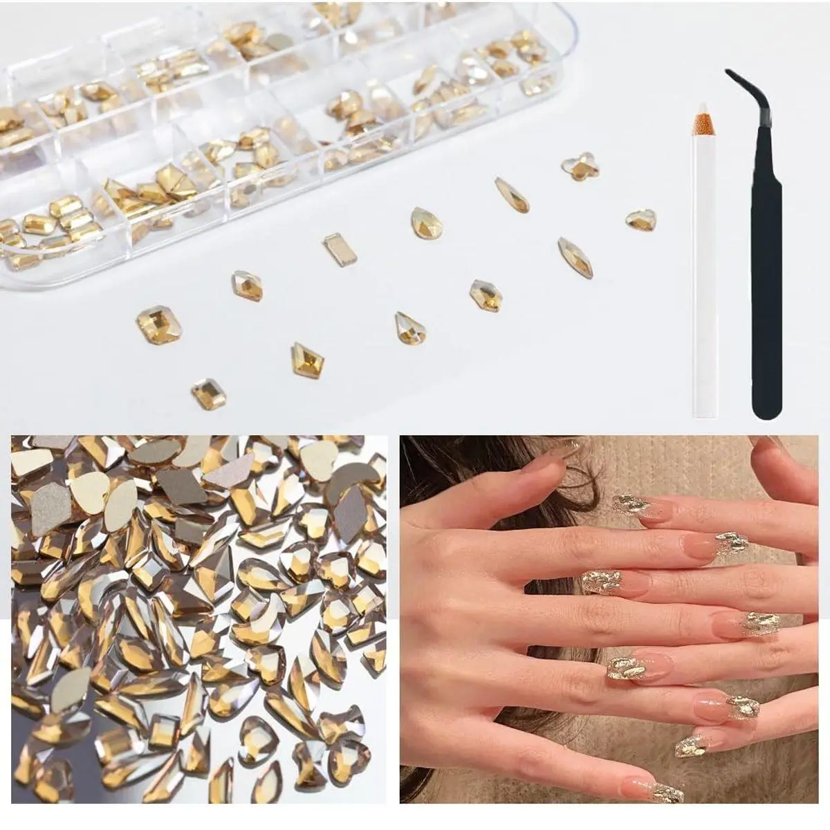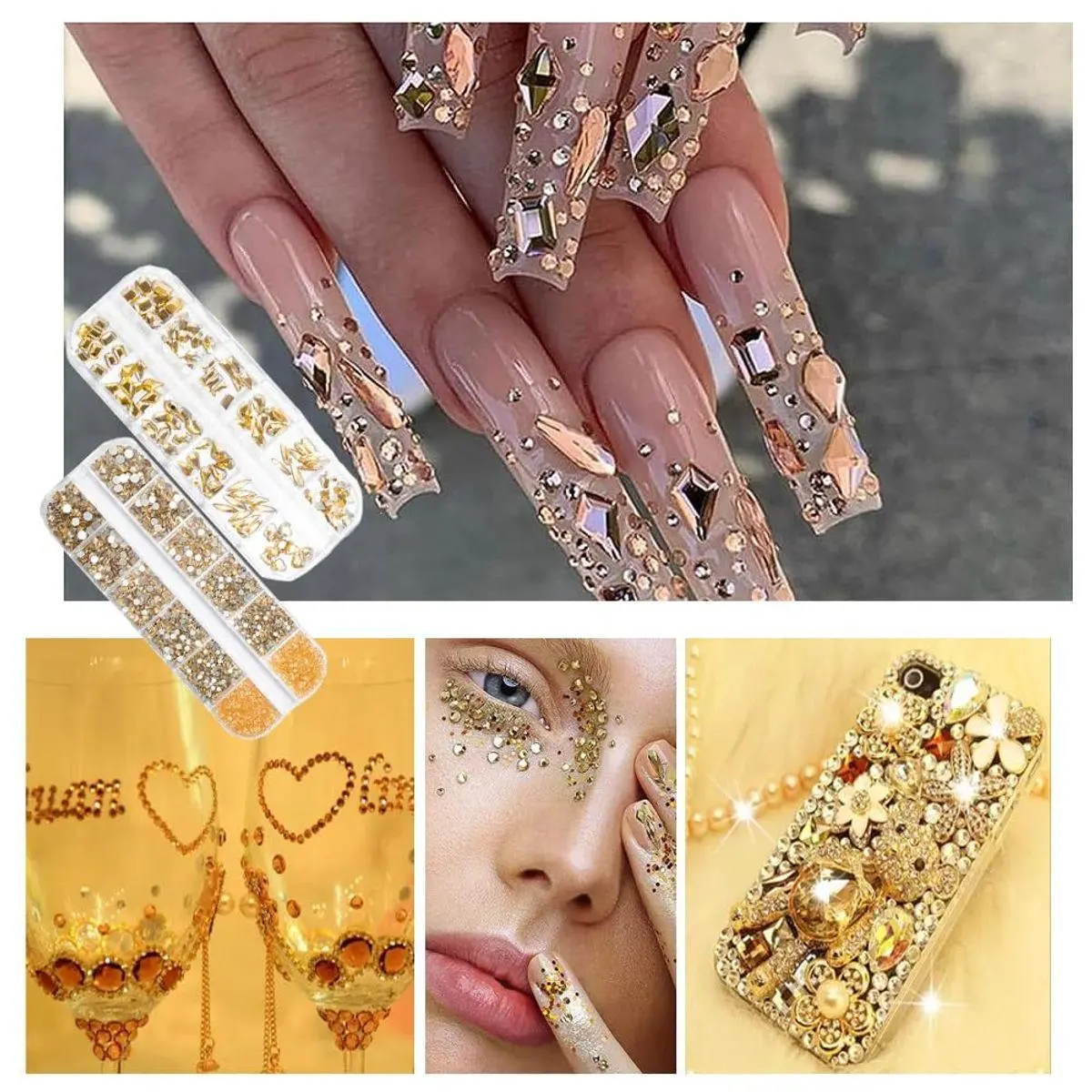 【120 Pcs Multi-Functional Nail Art Rhinestones】This gold gem nail rhinestones set is perfect for creating 3D nail art or decorating jewelry, makeup, Body Art, DIY Crafts, Wedding Dress or Shoes, Cell Phone Cases, Glasses, Greeting Cards, Bags, Guitars, Scrapbooks etcDIY clay production, DIY craft projects, clothing, wedding dresses, books, Christmas decorations, gift packaging, decoration, ceramics, greeting cards, logos, faces, eyes, cosmetics, computers, phone cases, invitation letters, etc.