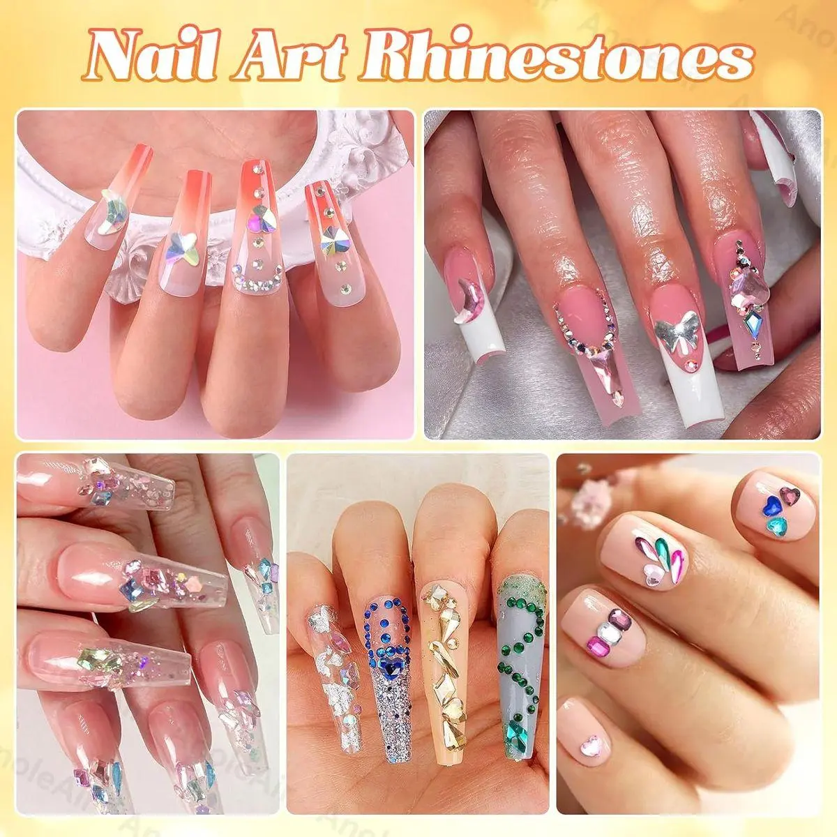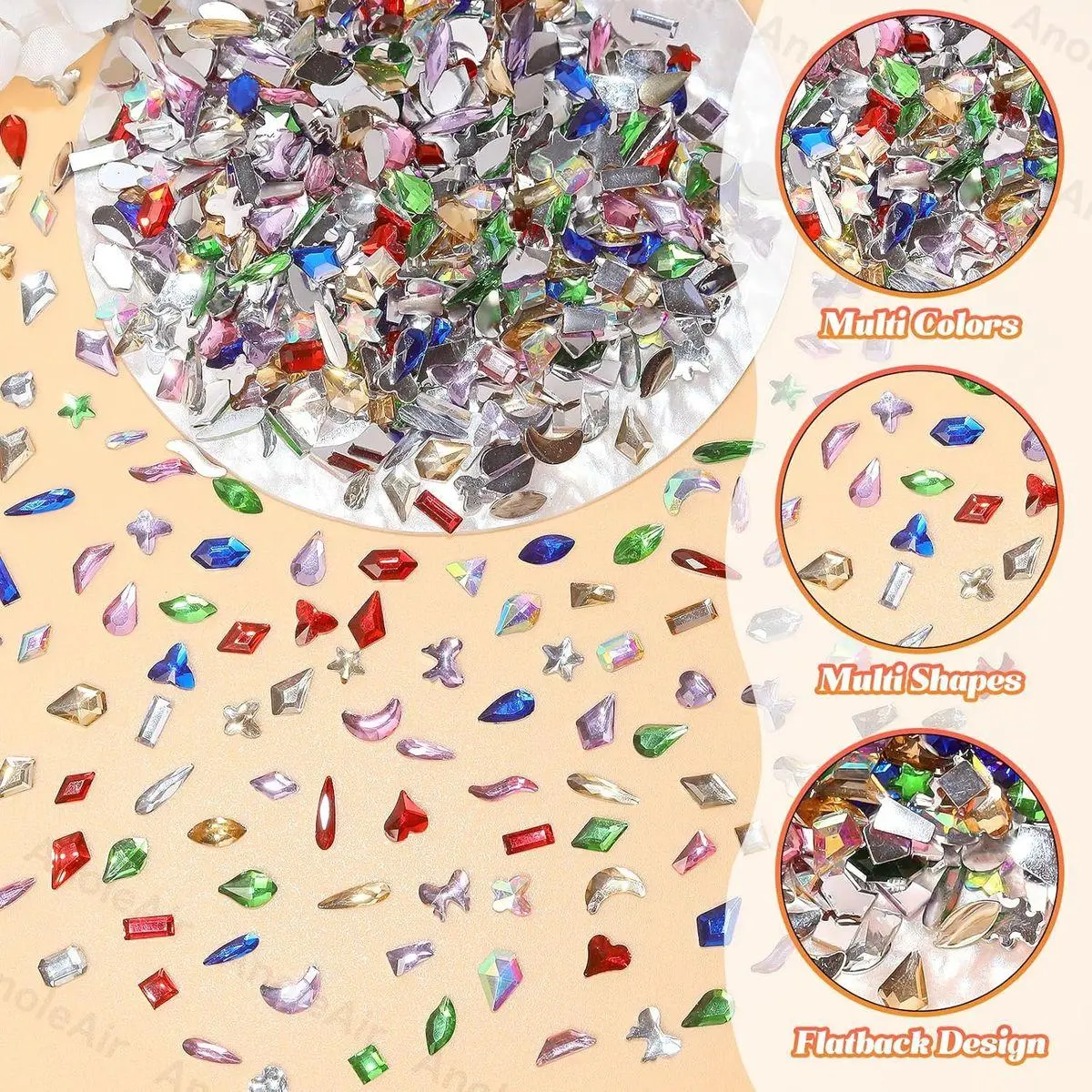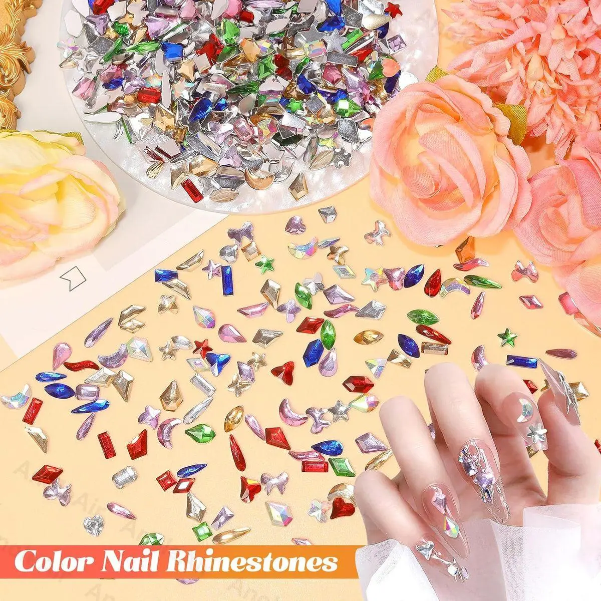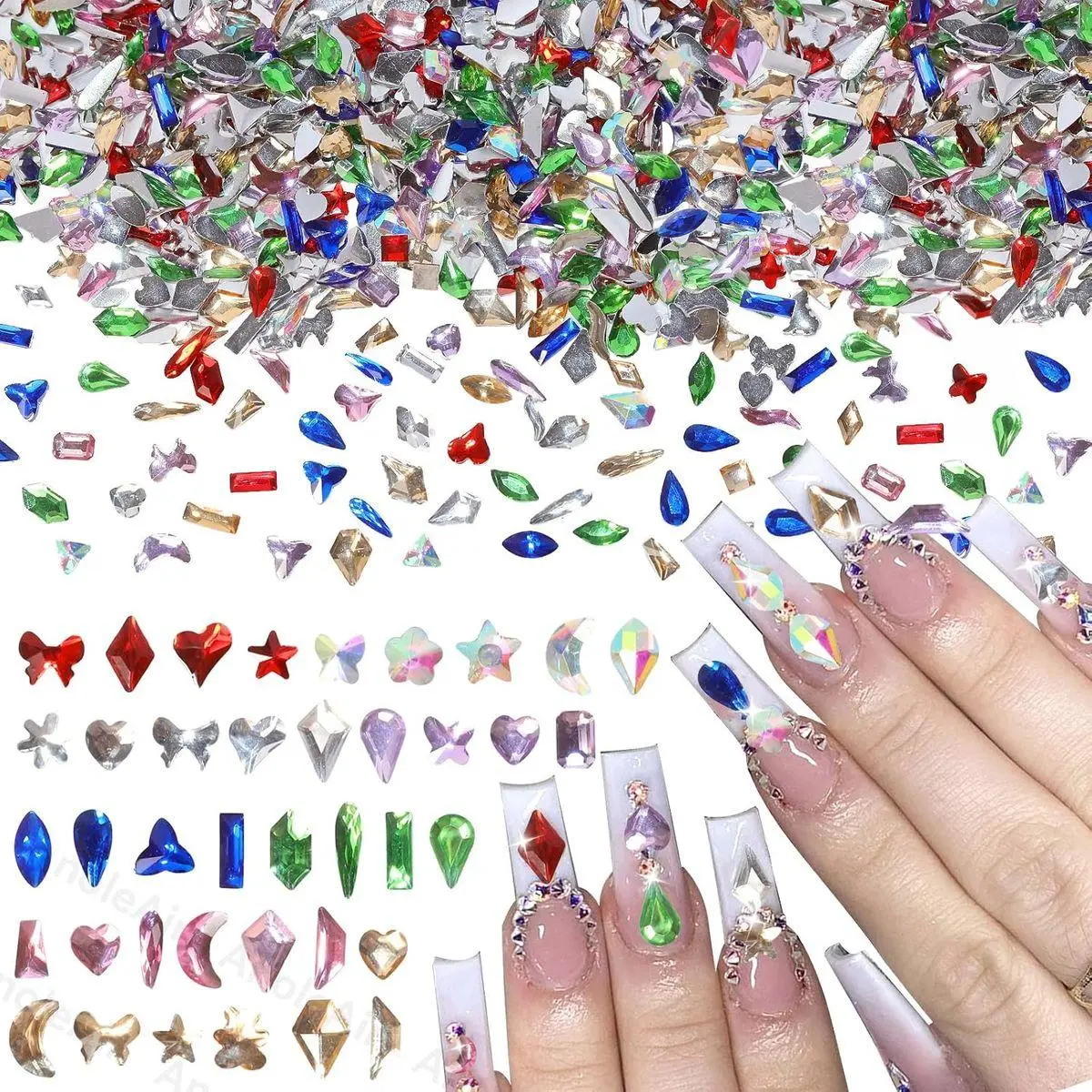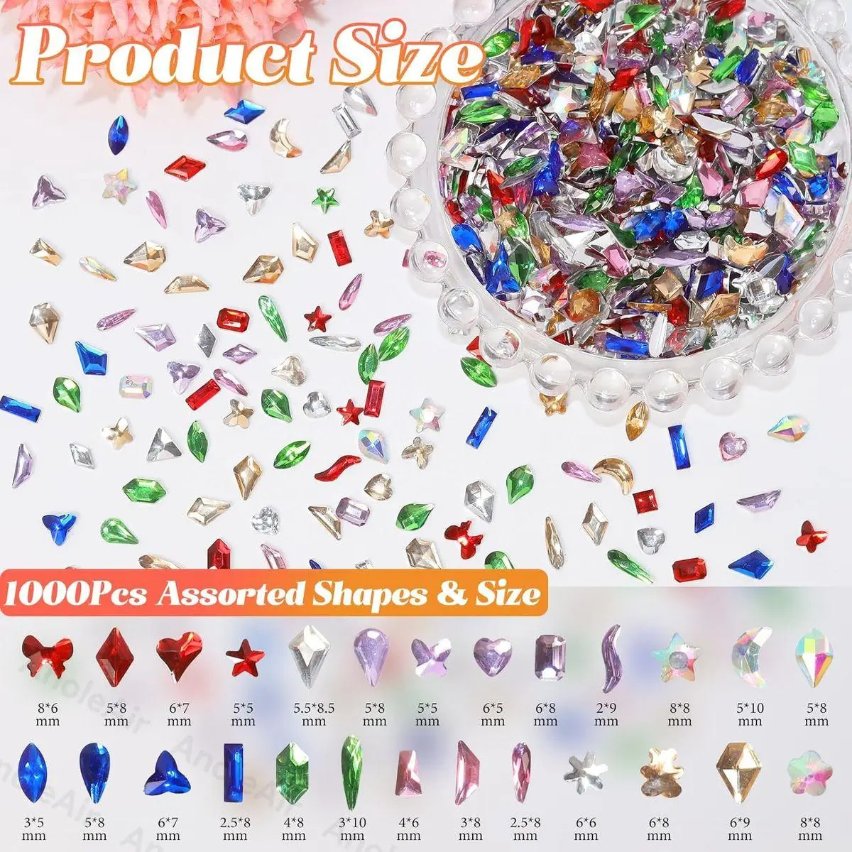 Multi Shape Color Rhinestones for Nails: These 1000 pcs color nail art rhinestone have multi style, like heart, star, rhombus, square, moon, water drop, triangle etc., The mixture of different sizes nail gems diamond makes it easier to achieve different designs of nail art, which add sparkle and glamour to your crafts