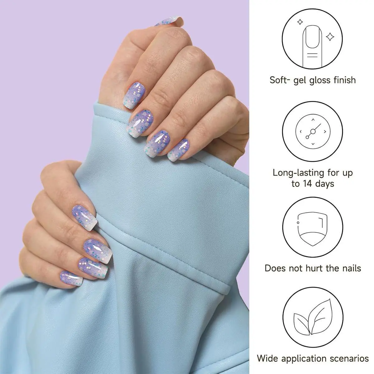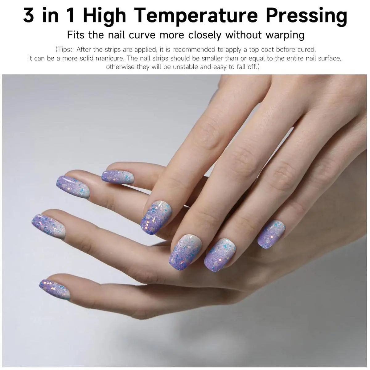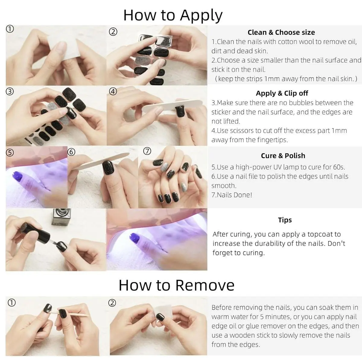 Material & advantages introduction: Our gel nail strips are pre-cured 60%, nail stickers for nail art is made of real gel nail polish, with elasticity and luster, durable, can last for two Week, harmless, safe and odorless, very skin-friendly