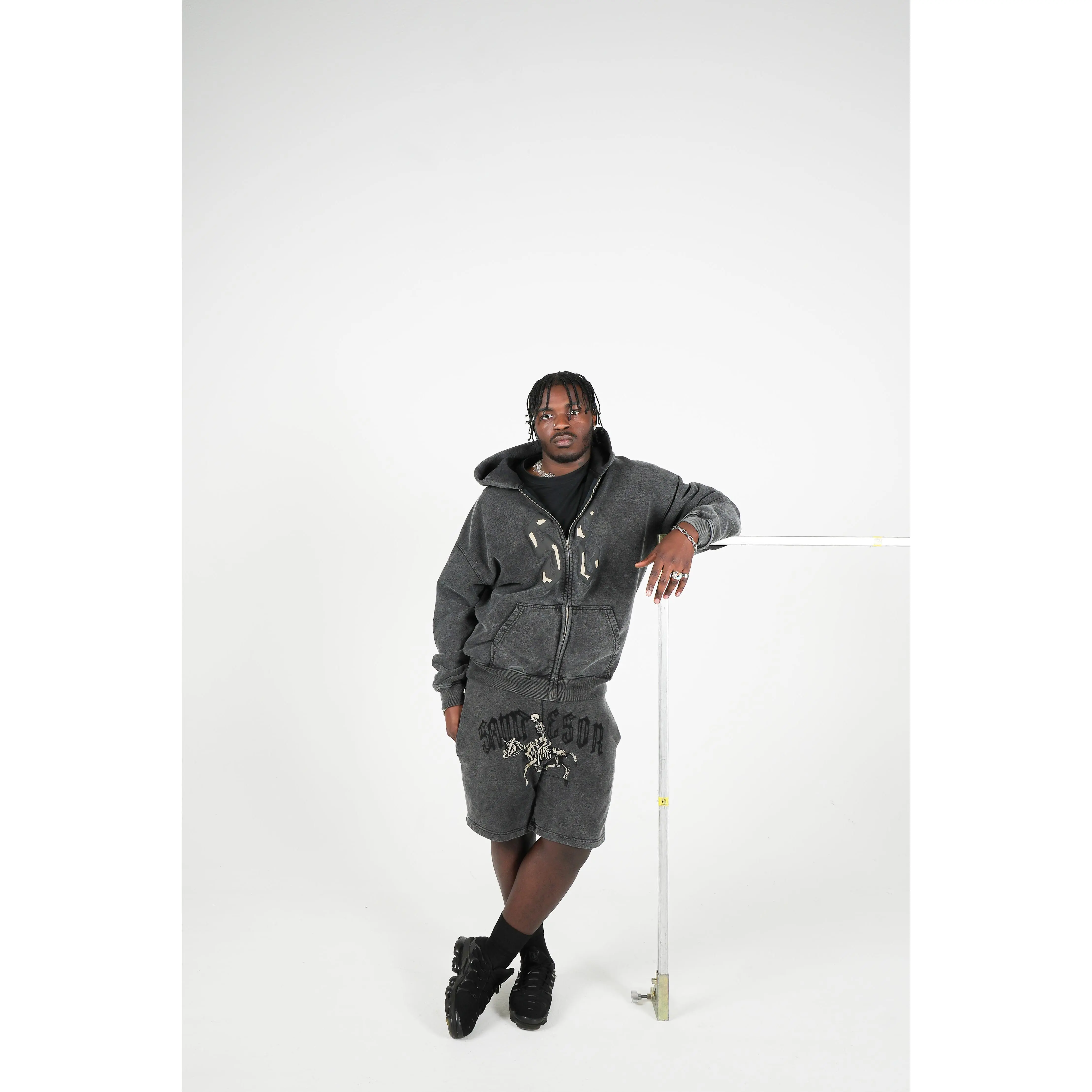 The black acid wash base gives each pair a worn, time-tested feel—like it’s already been through something. Across the front, the black and tan flock print brings the graphic to life with a velvet-like texture, adding depth and contrast without being loud. It’s gritty, elevated, and intentional.