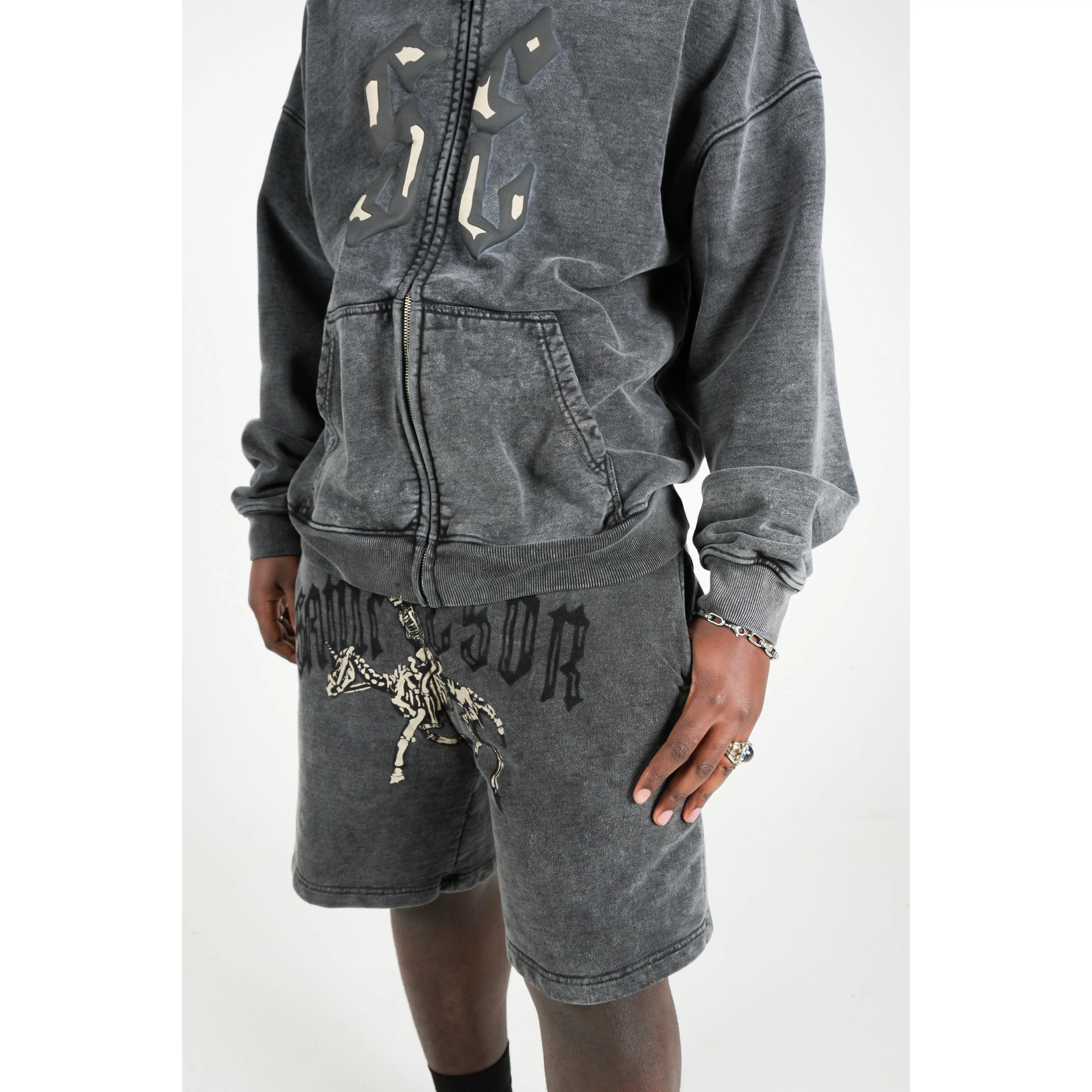 The Skeleton Rider Shorts take a darker turn on symbolism—where fantasy meets reality, and what’s left behind still moves forward. Featuring a unicorn stripped to bone with a skeleton rider mounted on top, this piece represents endurance beyond illusion. Even when everything is gone… something in you still rides.
