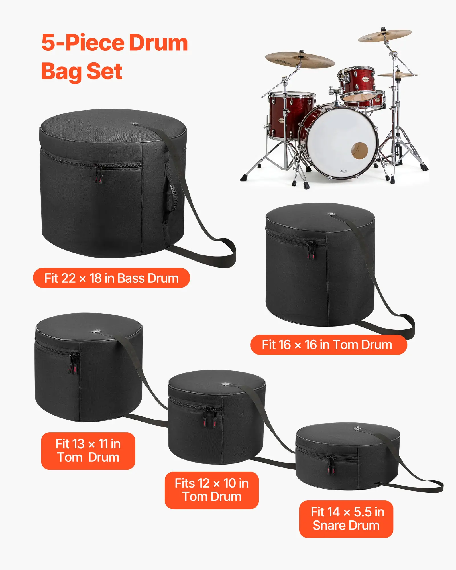 Full Drum Bag Set: Our drum bag set includes five heavy-duty drum bags, suitable for storing snare, bass, and tom drums of different sizes. These drum bags can be folded flat and stored under beds or in narrow spaces, ideal for small studios